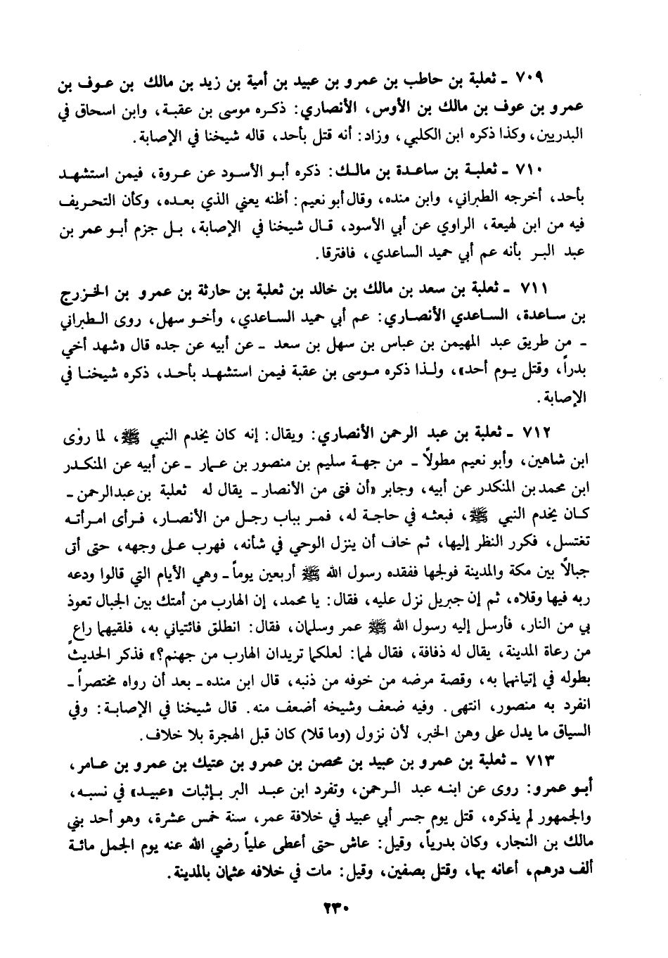 710 - ثعلبة بن ساعدة بن مالك ذكره أبو الأسود عن عروة فيمن استشهد بأحد أخرجه الطبراني وابن منده وقال أبو نعيم أظنه يعني الذي بعده وكأن التحريف فيه من ابن لهيعة الراوي عن أبي الأسود قال شيخنا في الإصابة بل جزم أبو عمر بن عبد البر بأنه عم أبي حميد الساعدي فافترقا.