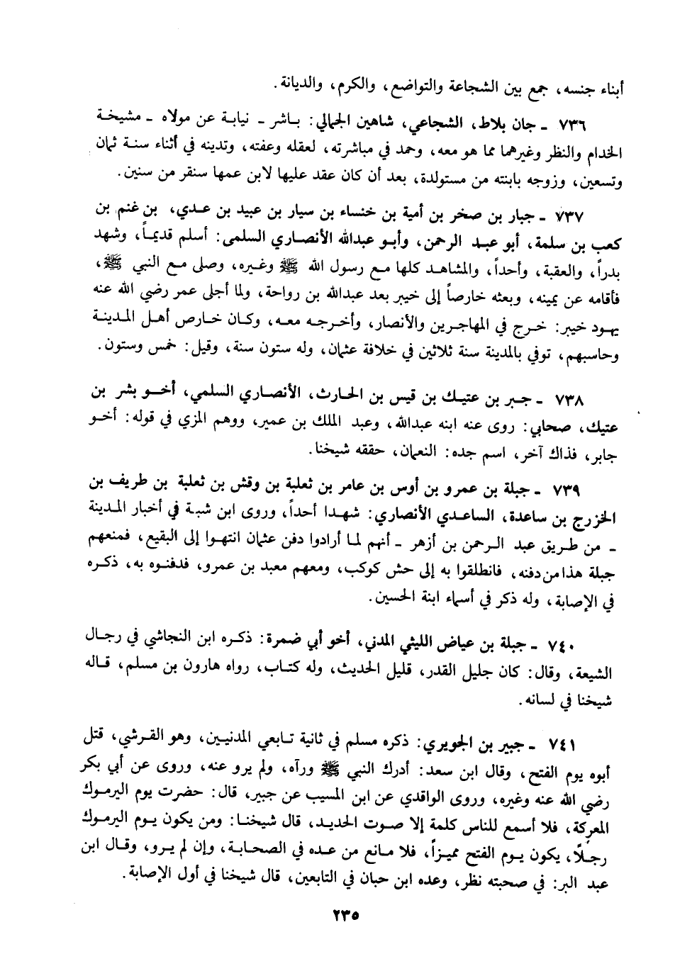 738 - جبر بن عتيك بن قيس بن الحارث الأنصاري السلمي أخو بشر بن عتيك صحابي روى عنه ابنه عبد الله وعبد الملك بن عمير ووهم المزي في قوله أخو جابر فذاك آخر اسم جده النعمان حققه شيخنا.