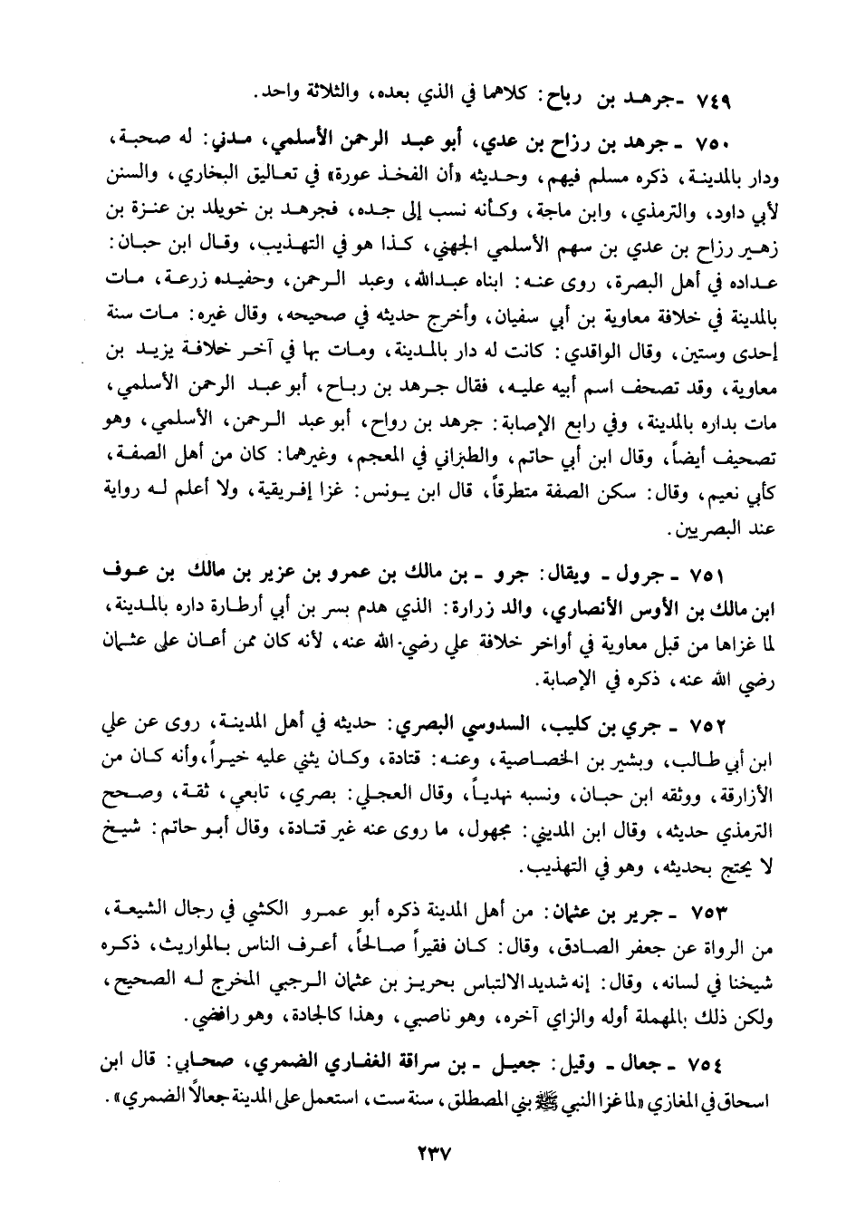 750 - جرهد بن رزاح بن عدي أبو عبد الرحمن الأسلمي مدني له صحبة ودار بالمدينة ذكره مسلم فيهم وحديثه أن الفخذ عورة في تعاليق البخاري والسنن لأبي داود والترمذي وابن ماجة وكأنه نسب إلى جده فجرهد بن خويلد بن عنزة بن زهير رزاح بن عدي بن سهم الأسلمي الجهني كذا هو في التهذيب وقال ابن حبان عداده في أهل البصرة روى عنه ابناه عبد الله وعبد الرحمن وحفيده زرعة مات بالمدينة في خلافة معاوية بن أبي سفيان وأخرج حديثه في صحيحه وقال غيره مات سنة إحدى وستين وقال الواقدي كانت له دار بالمدينة ومات بها في آخر خلافة يزيد بن معاوية وقد تصحف اسم أبيه عليه فقال جرهد بن رباح أبو عبد الرحمن الأسلمي مات بداره بالمدينة وفي رابع الإصابة جرهد بن رواح أبو عبد الرحمن الأسلمي وهو تصحيف أيضا وقال ابن أبي حاتم والطبراني في المعجم وغيرهما كان من أهل الصفة كأبي نعيم وقال سكن الصفة متطرقا قال ابن يونس غزا إفريقية ولا أعلم له رواية عند البصريين.