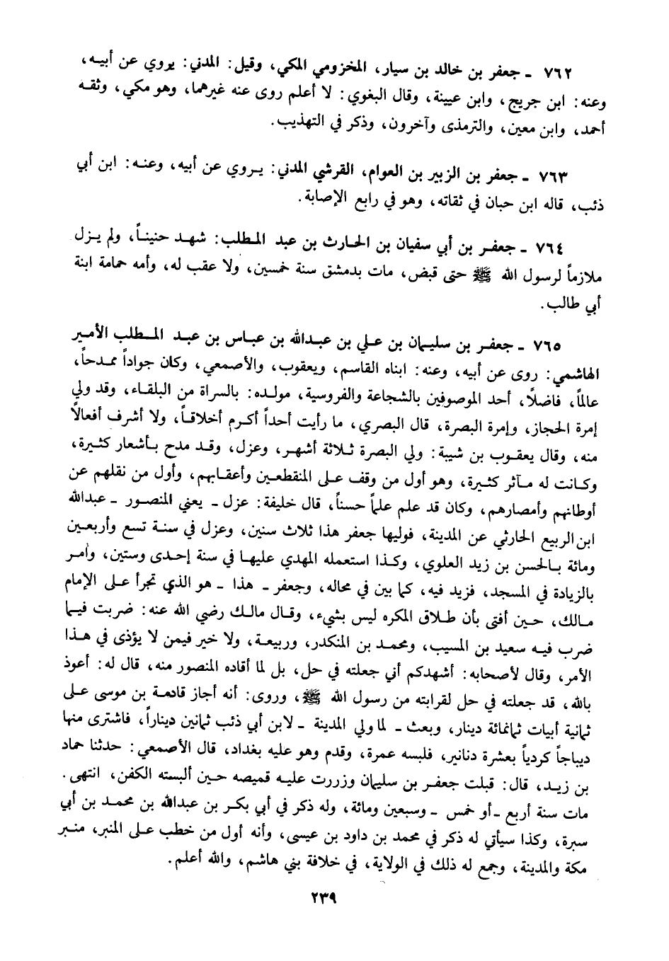 765 - جعفر بن سليمان بن علي بن عبد الله بن عباس بن عبد المطلب الأمير الهاشمي روى عن أبيه وعنه ابناه القاسم ويعقوب والأصمعي وكان جوادا ممدحا عالما فاضلا أحد الموصوفين بالشجاعة والفروسية مولده بالسراة من البلقاء وقد ولي إمرة الحجاز وإمرة البصرة قال البصري ما رأيت أحدا أكرم أخلاقا ولا أشرف أفعالا منه وقال يعقوب بن شيبة ولي البصرة ثلاثة أشهر وعزل وقد مدح بأشعار كثيرة وكانت له مآثر كثيرة وهو أول من وقف على المنقطعين وأعقابهم وأول من نقلهم عن أوطانهم وأمصارهم وكان قد علم علما حسنا قال خليفة عزل يعني المنصور عبد الله ابن الربيع الحارثي عن المدينة فوليها جعفر هذا ثلاث سنين وعزل في سنة تسع وأربعين ومائة بالحسن بن زيد العلوي وكذا استعمله المهدي عليها في سنة إحدى وستين وأمر بالزيادة في المسجد فزيد فيه كما بين في محاله وجعفر هذا هو الذي تجرأ على الإمام مالك حين أفتى بأن طلاق المكره ليس بشيء وقال مالك رضي الله عنه ضربت فيما ضرب فيه سعيد بن المسيب ومحمد بن المنكدر وربيعة ولا خير فيمن لا يؤذى في هذا الأمر وقال لأصحابه أشهدكم أني جعلته في حل بل لما أقاده المنصور منه قال له أعوذ بالله قد جعلته في حل لقرابته من رسول الله صلى الله عليه وسلم وروى أنه أجاز قادمة بن موسى على ثمانية أبيات ثمانمائة دينار وبعث لما ولي المدينة لابن أبي ذئب ثمانين دينارا فاشترى منها ديباجا كرديا بعشرة دنانير فلبسه عمرة وقدم وهو عليه بغداد قال الأصمعي حدثنا حماد بن زيد قال قبلت جعفر بن سليمان وزررت عليه قميصه حين ألبسته الكفن انتهى مات سنة أربع أو خمس وسبعين ومائة وله ذكر في أبي بكر بن عبد الله بن محمد بن أبي سبرة وكذا سيأتي له ذكر في محمد بن داود بن عيسى وأنه أول من خطب على المنبر منبر مكة والمدينة وجمع له ذلك في الولاية في خلافة بني هاشم والله أعلم.
