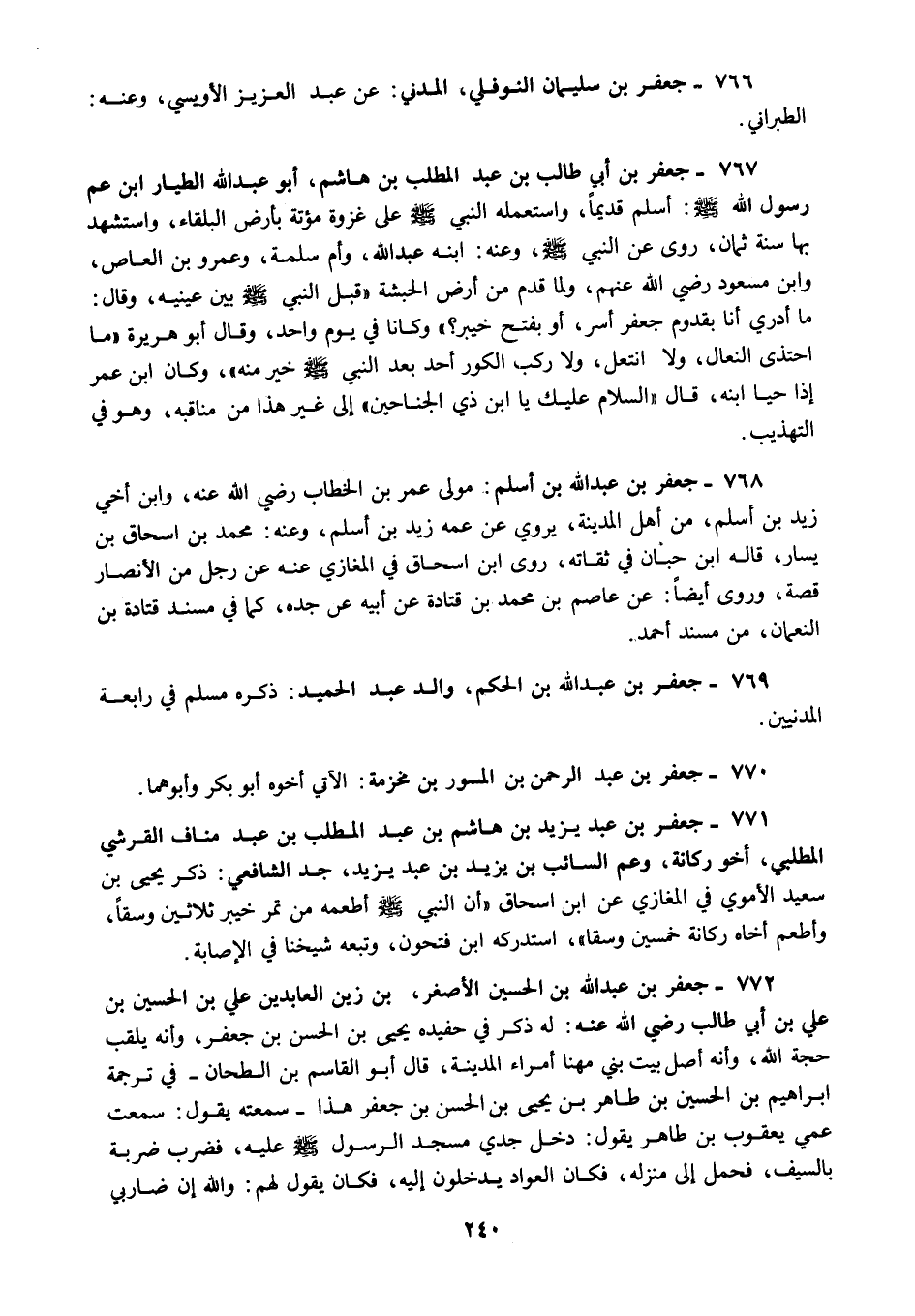 772 - جعفر بن عبد الله بن الحسين الأصغر بن زين العابدين علي بن الحسين بن علي بن أبي طالب رضي الله عنه له ذكر في حفيده يحيى بن الحسن بن جعفر وأنه يلقب حجة الله وأنه أصل بيت بني مهنا أمراء المدينة قال أبو القاسم بن الطحان في ترجمة إبراهيم بن الحسين بن طاهر بن يحيى بن الحسن بن جعفر هذا سمعته يقول سمعت عمي يعقوب بن طاهر يقول دخل جدي مسجد الرسول صلى الله عليه وسلم عليه فضرب ضربة بالسيف فحمل إلى منزله فكان العواد يدخلون إليه فكان يقول لهم والله إن ضاربي