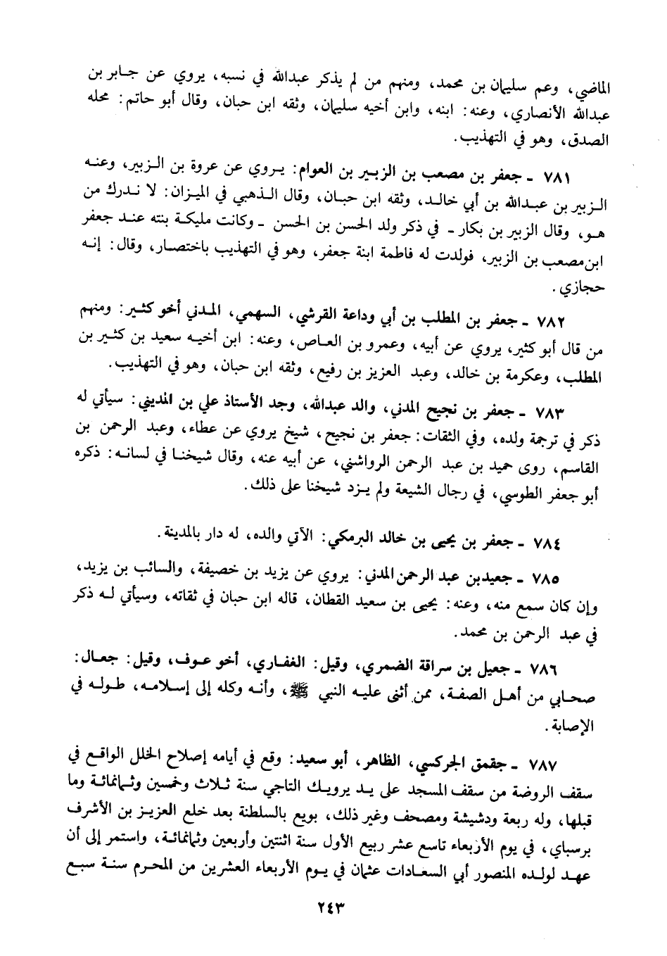 781 - جعفر بن مصعب بن الزبير بن العوام يروي عن عروة بن الزبير وعنه الزبير بن عبد الله بن أبي خالد وثقه ابن حبان وقال الذهبي في الميزان لا ندرك من هو وقال الزبير بن بكار في ذكر ولد الحسن بن الحسن وكانت مليكة بنته عند جعفر ابن مصعب بن الزبير فولدت له فاطمة ابنة جعفر وهو في التهذيب بإختصار وقال إنه حجازي.
