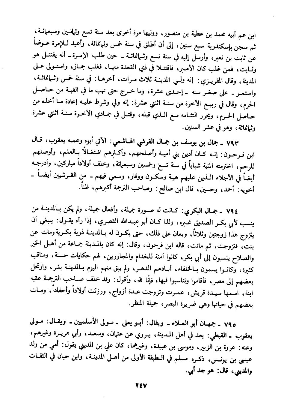 794 - جمال البكري كانت له صورة جميلة وأفعال جميلة ولم يكن بالمدينة من ينسب لأبي بكر الصديق غيره ولذا كان أبو عبد الله القصري إذا رآه يقول ينبغي أن يتزوج هذا زوجتين وثلاثا ويعان على ذلك حتى يكون له بالمدينة ذرية بكرية ومات عن بنت فتزوجت ثم ماتت قاله ابن فرحون وقال إنه كان بالمدينة جماعة من أهل الخير والصلاح ينسبون إلى أبي بكر كانوا أمنة للخدام والمجاورين لهم حكايات حسنة ومناقب كثيرة وكانوا يسمون بالخلفاء أبادهم الدهر ولم يبق منهم اليوم بالمدينة بشر وارتحل بعضهم إلى مصر فأقاموا وتناسبوا فيها فإنا لله وأقول وقد خلف صاحب الترجمة عقبه ابنة اسمها سيدة قريش عمرت وتزوجت عدة أزواج ورزقت أولادا وأحفادا ومات بعضهم في حياتها وهي ضريرة البصر جميلة المنظر.