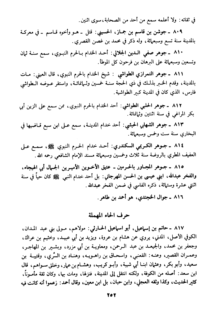 812 - جوهر الحلبي الطواشي أحد الخدام بالحرم النبوي ممن سمع على الزين أبي بكر المراغي في سنة اثنتين وثمانمائة.