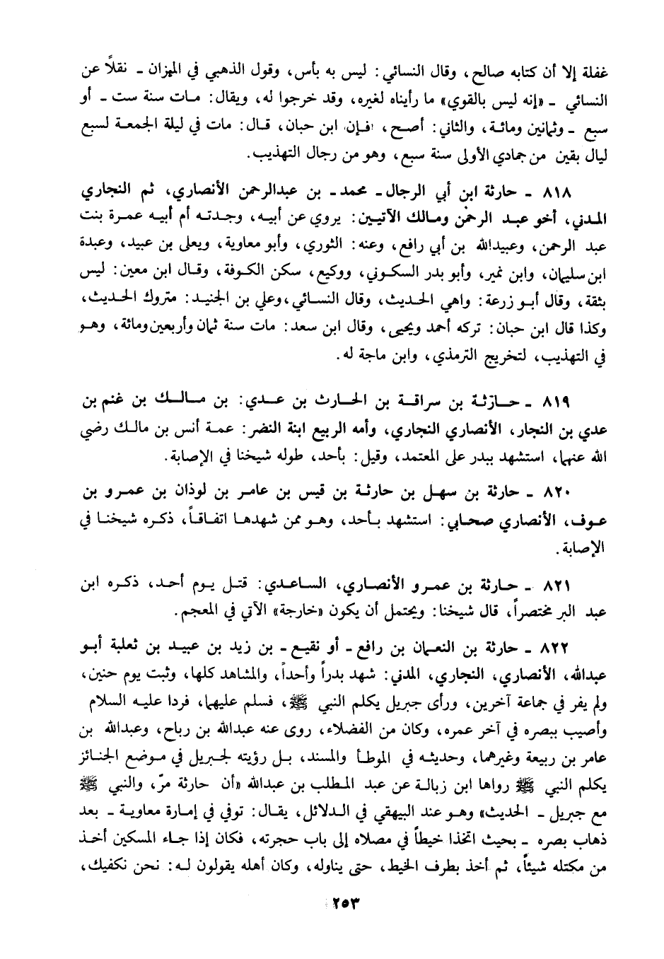 819 - حارثة بن سراقة بن الحارث بن عدي بن مالك بن غنم بن عدي بن النجار الأنصاري النجاري وأمه الربيع ابنة النضر عمة أنس بن مالك رضي الله عنهما استشهد ببدر على المعتمد وقيل بأحد طوله شيخنا في الإصابة.