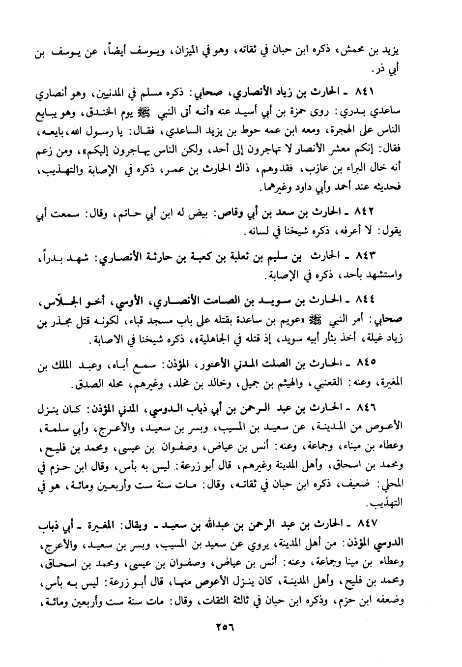 841 - الحارث بن زياد الأنصاري صحابي ذكره مسلم في المدنيين وهو أنصاري ساعدي بدري روى حمزة بن أبي أسيد عنه أنه أتى النبي صلى الله عليه وسلم يوم الخندق وهو يبايع الناس على الهجرة ومعه ابن عمه حوط بن يزيد الساعدي فقال يا رسول الله صلى الله عليه وسلم بايعه فقال "إنكم معشر الأنصار لا تهاجرون إلى أحد ولكن الناس يهاجرون إليكم" ومن زعم أنه خال البراء بن عازب فقد وهم ذاك الحارث بن عمر ذكره في الإصابة والتهذيب فحديثه عند أحمد وأبي داود وغيرهما.