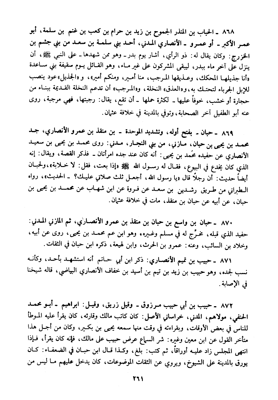 868 - الحباب بن المنذر الجموح بن زيد بن حرام بن كعب بن غنم بن سلمة أبو عمر الأكبر أو عمرو الأنصاري المدني أحد بني سلمة بن سعد من بني جشم بن الخزرج وكان يقال له ذو الرأي أشار يوم بدر وهو ممن شهدها على النبي صلى الله عليه وسلم أن ينزل على آخر ماء ببدر ليبقى المشركون على غير ماء وهو القائل يوم سقيفة بني ساعدة أنا جذيلها المحكك وعذيقها المرجب منا أمير ومنكم أمير والجذيل عود ينصب للإبل الجرباء لتحتك به والعذق النخلة والمرجب أن تدعم النخلة القديمة ببناء من حجارة أو خشب خوفا عليها لكثرة حملها أن تقع يقال رجبتها فهي مرجبة روى عنه أبو الطفيل آخر الصحابة وتوفي بالمدينة في خلافة عثمان.