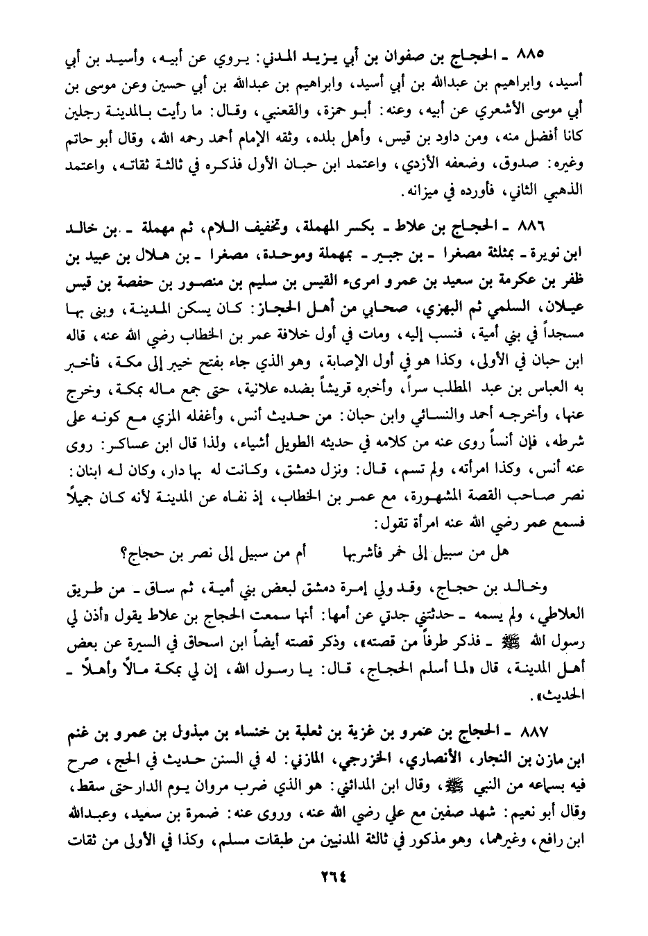 886 - الحجاج بن علاط بكسر المهملة وتخفيف اللام ثم مهملة بن خالد ابن نويرة بمثلثة مصغرا بن جبير بمهملة وموحدة مصغرا بن هلال بن عبيد بن ظفر بن عكرمة بن سعيد بن عمرو امرىء القيس بن سليم بن منصور بن حفصة بن قيس عيلان السلمي ثم البهزي صحابي من أهل الحجاز كان يسكن المدينة وبنى بها مسجدا في بني أمية فنسب إليه ومات في أول خلافة عمر بن الخطاب رضي الله عنه قاله ابن حبان في الأولى وكذا هو في أول الإصابة وهو الذي جاء بفتح خيبر إلى مكة فأخبر به العباس بن عبد المطلب سرا وأخبره قريشا بضده علانية حتى جمع ماله بمكة وخرج عنها وأخرجه أحمد والنسائي وابن حبان من حديث أنس وأغفله المزي مع كونه على شرطه فإن أنسا روى عنه من كلامه في حديثه الطويل أشياء ولذا قال ابن عساكر روى عنه أنس وكذا امرأته ولم تسم قال ونزل دمشق وكانت له بها دار وكان له ابنان نصر صاحب القصة المشهورة مع عمر بن الخطاب إذ نفاه عن المدينة لأنه كان جميلا فسمع عمر رضي الله عنه امرأة تقول: