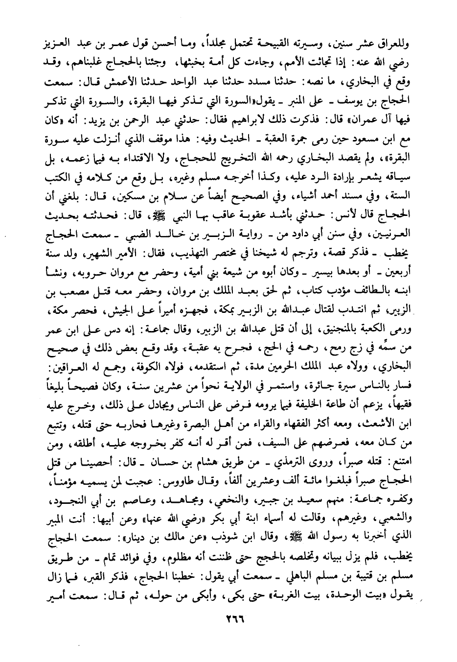 وللعراق عشر سنين وسيرته القبيحة تحتمل مجلدا وما أحسن قول عمر بن عبد العزيز رضي الله عنه إذا تجاثت الأمم وجاءت كل أمة بخبثها وجئنا بالحجاج غلبناهم وقد وقع في البخاري ما نصه حدثنا مسدد حدثنا عبد الواحد حدثنا الأعمش قال سمعت الحجاج بن يوسف على المنبر يقول السورة التي تذكر فيها البقرة والسورة التي تذكر فيها آل عمران قال فذكرت ذلك لإبراهيم فقال حدثني عبد الرحمن بن يزيد أنه كان مع ابن مسعود حين رمى جمرة العقبة الحديث وفيه هذا موقف الذي أنزلت عليه سورة البقرة ولم يقصد البخاري رحمه الله التخريج للحجاج ولا الاقتداء به فيما زعمه بل سياقه يشعر بإراداة الرد عليه وكذا أخرجه مسلم وغيره بل وقع من كلامه في الكتب الستة وفي مسند أحمد أشياء وفي الصحيح أيضا عن سلام بن مسكين قال بلغني أن الحجاج قال لأنس حدثني بأشد عقوبة عاقب بها النبي صلى الله عليه وسلم قال فحدثته بحديث العرنيين وفي سنن أبي داود من رواية الزبير بن خالد الضبي سمعت الحجاج يخطب فذكر قصة وترجم له شيخنا في مختصر التهذيب فقال الأمير الشهير ولد سنة أربعين أو بعدها بيسير وكان أبوه من شيعة بني أمية وحضر مع مروان حروبه ونشأ ابنه بالطائف مؤدب كتاب ثم لحق بعبد الملك بن مروان وحضر معه قتل مصعب بن الزبير ثم انتدب لقتال عبد الله بن الزبير بمكة فجهزه أميرا على الجيش فحصر مكة ورمى الكعبة بالمنجنيق إلى أن قتل عبد الله بن الزبير وقال جماعة إنه دس على ابن عمر من سمه في زج رمح رحمه في الحج فجرح به عقبه وقد وقع بعض ذلك في صحيح البخاري وولاه عبد الملك الحرمين مدة ثم استقدمه فولاه الكوفة وجمع له العراقين فسار بالناس سيرة جائرة واستمر في الولاية نحوا من عشرين سنة وكان فصيحا بليغا فقيها يزعم أن طاعة الخليفة فيما يرومه فرض على الناس ويجادل على ذلك وخرج عليه ابن الأشعث ومعه أكثر الفقهاء والقراء من أهل البصرة وغيرها فحاربه حتى قتله وتتبع من كان معه فعرضهم على السيف فمن أقر له أنه كفر بخروجه عليه أطلقه ومن امتنع قتله صبرا وروى الترمذي من طريق هشام بن حسان قال أحصينا من قتل الحجاج صبرا فبلغوه مائة ألف وعشرين ألفا وقال طاووس عجبت لمن يسميه مؤمنا وكفره جماعة منهم سعيد بن جبير والنخعي ومجاهد وعاصم بن أبي النجود والشعبي وغيرهم وقالت له أسماء ابنة أبي بكر رضي الله عنها وعن أبيها أنت المبير الذي أخبرنا به رسول الله صلى الله عليه وسلم وقال ابن شوذب عن مالك بن دينار سمعت الحجاج يخطب فلم يزل ببيانه وتخلصه بالحجج حتى ظننت أنه مظلوم وفي فوائد تمام من طريق مسلم بن قتيبة بن مسلم الباهلي سمعت أبي يقول خطبنا الحجاج فذكر القبر فما زال يقول بيت الوحدة بيت الغربة حتى بكىى وأبكى من حوله ثم قال سمعت أمير