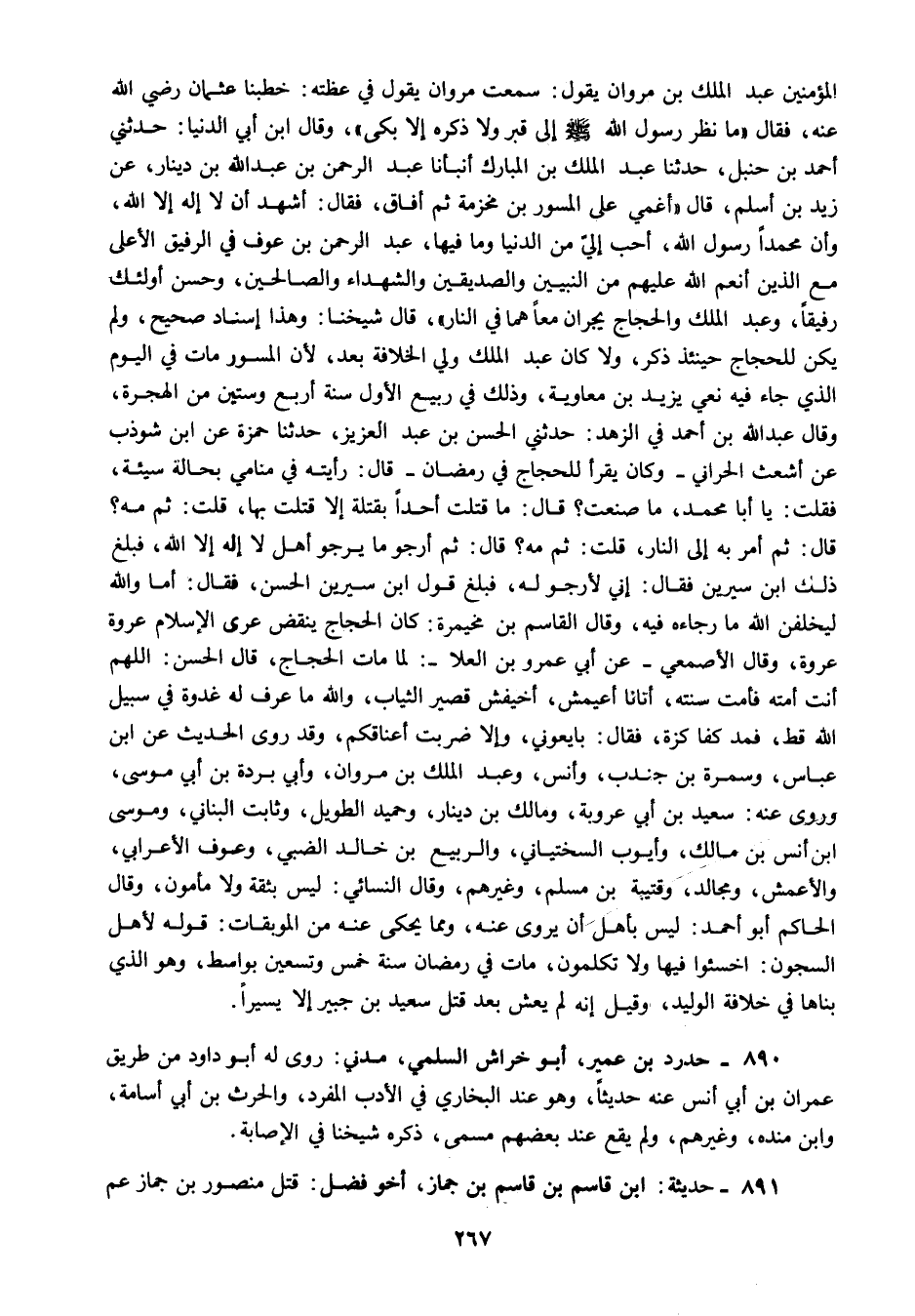 المؤمنين عبد الملك بن مروان يقول سمعت مروان يقول في عظته خطبنا عثمان رضي الله عنه فقال ما نظر رسول الله صلى الله عليه وسلم إلى قبر ولا ذكره إلا بكى وقال ابن أبي الدنيا حدثني أحمد بن حنبل حدثنا عبد الملك بن المبارك أنبأنا عبد الرحمن بن عبد الله بن دينار عن زيد بن أسلم قال أغمي على المسور بن مخزمة ثم أفاق فقال أشهد أن لا إله إلا الله وأن محمدا رسول الله صلى الله عليه وسلم أحب إلي من الدنيا وما فيها عبد الرحمن بن عوف في الرفيق الأعلى مع الذين أنعم الله عليهم من النبيين والصديقين والشهداء والصالحين وحسن أولئك رفيقا وعبد الملك والحجاج يجران معا هما في النار قال شيخنا وهذا إسناد صحيح ولم يكن للحجاج حينئذ ذكر ولا كان عبد الملك ولي الخلافة بعد لأن المسور مات في اليوم الذي جاء فيه نعي يزيد بن معاوية وذلك في ربيع الأول سنة أربع وستين من الهجرة وقال عبد الله بن أحمد في الزهد حدثني الحسن بن عبد العزيز حدثنا حمزة عن ابن شوذب عن أشعث الحراني وكان يقرأ للحجاج في رمضان قال رأيته في منامي بحالة سيئة فقلت يا أبا محمد ما صنعت قال ما قتلت أحدا بقتلة إلا قتلت بها قلت ثم مه قال ثم أمر به إلى النار قلت ثم مه قال ثم أرجو ما يرجو أهل لا إله إلا الله فبلغ ذلك ابن سيرين فقال إني لأرجو فبلغ قول ابن سيرين الحسن فقال أما والله ليخلفن الله ما رجاءه فيه وقال القاسم بن مخيمرة كان الحجاج ينقض عرى الإسلام عروة عروة وقال الأصمعي عن أبي عمرو بن العلا لما مات الحجاج قال الحسن اللهم أنت أمته فأمت سنته أتانا أعيمش أخيفش قصير الثياب والله ما عرف له غدوة في سبيل الله قط فمد كفا كزة فقال بايعوني وإلا ضربت أعناقكم وقد روى الحديث عن ابن عباس وسمرة بن جندب وأنس وعبد الملك بن مروان وأبي بردة بن أبي موسى وروى عنه سعيد بن أبي عروبة ومالك بن دينار وحميد الطويل وثابت البناني وموسى ابن أنس بن مالك وأيوب السختياني والربيع بن خالد الضبي وعوف الأعرابي والأعمش ومجالد وقتيبة بن مسلم وغيرهم وقال النسائي ليس بثقة ولا مأمون وقال الحاكم أبو أحمد ليس بأهل أن يروى عنه ومما يحكى عنه من الموبقات قوله لأهل السجون اخسئوا فيها ولا تكلمون مات في رمضان سنة خمس وتسعين بواسط وهو الذي بناها في خلافة الوليد وقيل أنه لم يعش بعد قتل سعيد بن جبير إلا يسيرا.
