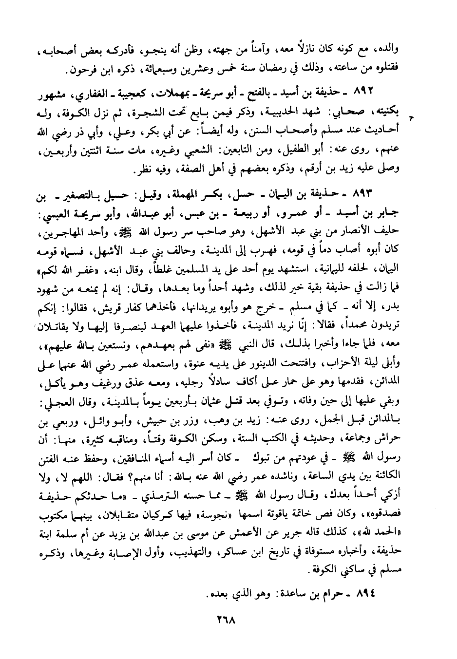 893 - حذيفة بن اليمان حسل بكسر المهملة وقيل حسيل بالتصغير بن جابر بن أسيد أو عمرو أو ربيعة بن عبس أبو عبد الله وأبو سريحة العبسي حليف الأنصار من بني عبد الأشهل وهو صاحب سر رسول الله صلى الله عليه وسلم وأحد المهاجرين كان أبوه أصاب دما في قومه فهرب إلى المدينة وحالف بني عبد الأشهل فسماه قومه اليمان لحلفه لليمانية استشهد يوم أحد على يد المسلمين غلطا وقال ابنه غفر الله لكم فما زالت في حذيفة بقية خير لذلك وشهد أحدا وما بعدها وقال إنه لم يمنعه من شهود بدر إلا أنه كما في مسلم خرج هو وأبوه يريدانها فأخذهما كفار قريش فقالوا إنكم تريدون محمدا فقالا إنا نريد المدينة فأخذوا عليهما العهد لينصرفا إليها ولا يقاتلان معه فلما جاءا وأخبرا بذلك قال النبي صلى الله عليه وسلم "نفى لهم بعهدهم ونستعين بالله عليهم" وأبلى ليلة الأحزاب وافتتحت الدينور على يديه عنوة واستعمله عمر رضي الله عنهما على المدائن فقدمها وهو على حمار على أكاف سادلا رجليه ومعه عذق ورغيف وهو يأكل وبقي عليها إلى حين وفاته وتوفي بعد قتل عثمان بأربعين يوما بالمدينة وقال العجلي بالمدائن قبل الجمل روى عنه زيد بن وهب وزر بن حبيش وأبو وائل وربعي بن حراش وجماعة وحديثه في الكتب الستة وسكن الكوفة وقتا ومناقبه كثيرة منها أن رسول الله صلى الله عليه وسلم في عودتهم من تبوك كان أسر إليه أسماء المنافقين وحفظ عنه الفتن الكائنة بين يدي الساعة وناشده عمر رضي الله عنه بالله أنا منهم فقال اللهم لا ولا أزكي أحدا بعدك وقال رسول الله صلى الله عليه وسلم مما حسنه الترمذي "ما حدثكم حذيفة فصدقوه" وكان فص خاتمة ياقوتة اسمها نجوسة فيها كركيان متقابلان بينهما مكتوب الحمد الله كذلك قاله جرير عن الأعمش عن موسى بن عبد الله بن يزيد عن أم سلمة ابنة حذيفة وأخباره مستوفاه في تاريخ ابن عساكر والتهذيب وأول الإصابة وغيرها وذكره مسلم في ساكني الكوفة.