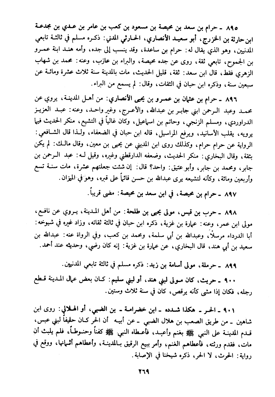 895 - حرام بن سعد بن محيصة بن مسعود بن كعب بن عامر بن عدي بن مجدعة ابن حارثة بن الخزرج أبو سعيد الأنصاري الحارثي المدني ذكره مسلم في ثالثة تابعي المدنيين وهو الذي يقال له حرام بن ساعدة وقد ينسب إلى جده وأمه هند ابنة عمرو بن الجموح تابعي ثقة روى عن جده محيصة والبراء بن عازب وعنه محمد بن شهاب الزهري فقط قال ابن سعد ثقة قليل الحديث مات بالمدينة سنة ثلاث عشرة ومائة عن سبعين سنة وذكره ابن حبان في الثقات وقال لم يسمع من البراء.