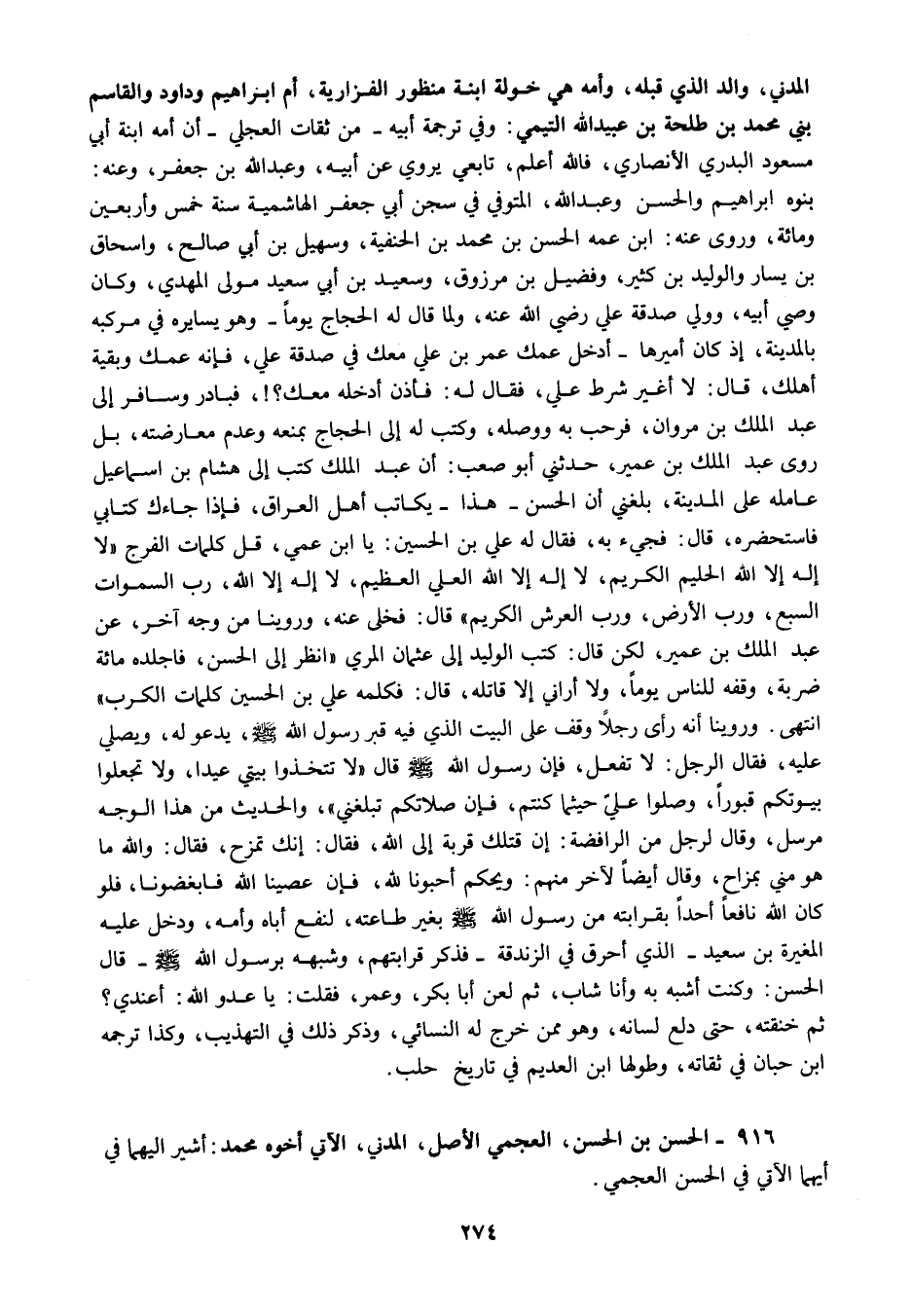 المدني والد الذي قبله وأمه هي خولة ابنة منظور الفزارية أم إبراهيم وداود والقاسم بني محمد بن طلحة بن عبيد الله التيمي وفي ترجمة أبيه من ثقات العجلي أن أمه ابنة أبي مسعود البدري الأنصاري فالله أعلم تابعي يروي عن أبيه وعبد الله بن جعفر وعنه بنوه إبراهيم والحسن وعبد الله المتوفي في سجن أبي جعفر الهاشمية سنة خمس وأربعين ومائة وروى عنه ابن عمه الحسن بن محمد بن الحنفية وسهيل بن أبي صالح وإسحاق بن يسار والوليد بن كثير وفضيل بن مرزوق وسعيد بن أبي سعيد مولى المهدي وكان وصي أبيه وولي صدقة علي رضي الله عنه ولما قال له الحجاج يوما وهو يسايره في مركبه بالمدينة إذ كان أميرها أدخل عمك عمر بن علي معك في صدقة علي فإنه عمك وبقية أهلك قال لا أغير شرط علي فقال له فأذن أدخله معك فبادر وسافر إلى عبد الملك بن مروان فرحب به ووصله وكتب له إلى الحجاج بمنعه وعدم معارضته بل روى عبد الملك بن عمير حدثني أبو صعب أن عبد الملك كتب إلى هشام بن إسماعيل عامله على المدينة بلغني أن الحسن هذا يكاتب أهل العراق فإذا جاءك كتابي فاستحضره قال فجيء به فقال له علي بن الحسين يا ابن عمي قل كلمات الفرج لا إله إلا الله الحليم الكريم لا إله إلا الله العلي العظيم لا إله إلا الله رب السموات السبع ورب الأرض ورب العرش الكريم قال فخلى عنه وروينا من وجه آخر عن عبد الملك بن عمير لكن قال كتب الوليد إلى عثمان المري انظر إلى الحسن فاجلده مائة ضربة وقفه للناس يوما ولا أراني إلا قاتله قال فكلمه علي بن الحسين كلمات الكرب انتهى وروينا أنه رأى رجلا وقف على البيت الذي فيه قبر رسول الله صلى الله عليه وسلم يدعو له ويصلي عليه فقال الرجل لا تفعل فإن رسول الله صلى الله عليه وسلم قال: "لا تتخذوا بيتي عيدا ولا تجعلوا بيوتكم قبورا وصلوا علي حيثما كنتم فإن صلاتكم تبلغني" والحديث من هذا الوجه مرسل وقال لرجل من الرافضة إن قتلك قربة إلى الله فقال إنك تمزح فقال والله ما هو مني بمزاح وقال أيضا لآخر منهم ويحكم أحبونا الله فإن عصينا الله فابغضونا فلو كان الله نافعا أحدا بقرابته من رسول الله صلى الله عليه وسلم بغير طاعته لنفع أباه وأمه ودخل عليه المغيرة بن سعيد الذي أحرق في الزندقة فذكر قرابتهم وشبهه برسول الله صلى الله عليه وسلم قال الحسن وكنت أشبه به وأنا شاب ثم لعن أبا بكر وعمر فقلت يا عدو الله أعندي ثم خنقته حتى دلع لسانه وهو ممن خرج له النسائي وذكر ذلك في التهذيب وكذا ترجمه ابن حبان في ثقاته وطولها ابن العديم في تاريخ حلب.