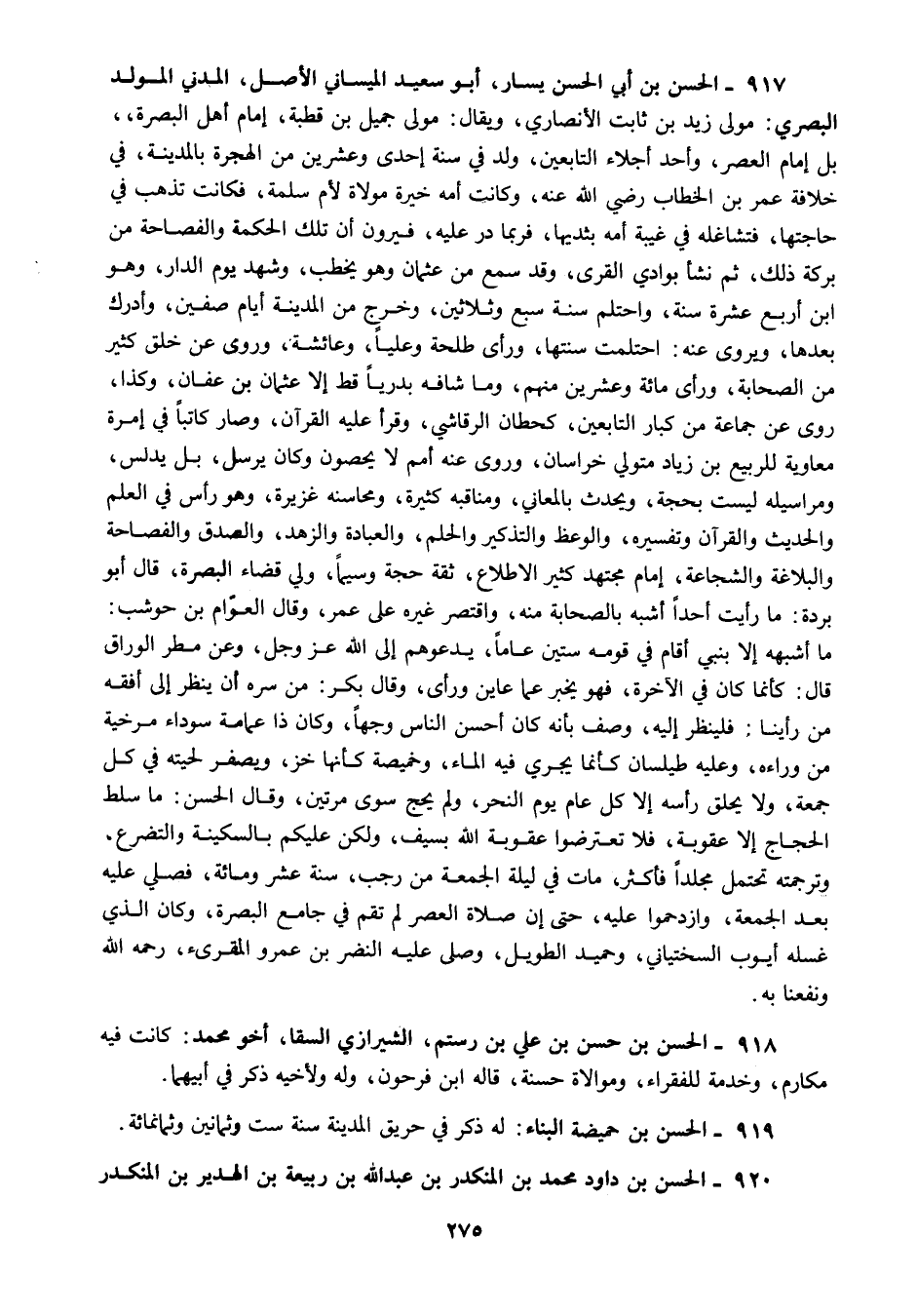 917 - الحسن بن أبي الحسن يسار أبو سعيد الميساني الأصل المدني المولد البصري مولى زيد بن ثابت الأنصاري ويقال مولى جميل بن قطبة إمام أهل البصرة بل إمام العصر وأحد أجلاء التابعين ولد في سنة إحدى وعشرين من الهجرة بالمدينة في خلافة عمر بن الخطاب رضي الله عنه وكانت أمه خيرة مولاة لأم سلمة فكانت تذهب في حاجتها فتشاغله في غيبة أمه بثديها فربما در عليه فيرون أن تلك الحكمة والفصاحة من بركة ذلك ثم نشأ بوادي القرى وقد سمع من عثمان وهو يخطب وشهد يوم الدار وهو ابن أربع عشرة سنة واحتلم سنة سبع وثلاثين وخرج من المدينة أيام صفين وأدرك بعدها ويروى عنه احتلمت سنتها ورأى طلحة وعليا وعائشة وروى عن خلق كثير من الصحابة ورأى مائة وعشرين منهم وما شافه بدريا قط إلا عثمان بن عفان وكذا روى عن جماعة من كبار التابعين كحطان الرقاشي وقرأ عليه القرآن وصار كاتبا في إمرة معاوية للربيع بن زياد متولي خراسان وروى عنه أمم لا يحصون وكان يرسل بل يدلس ومراسيله ليست بحجة ويحدث بالمعاني ومناقبه كثيرة ومحاسنه غزيرة وهو رأس في العلم والحديث والقرآن وتفسيره والوعظ والتذكير والحلم والعبادة والزهد والصدق والفصاحة والبلاغة والشجاعة إمام مجتهد كثير الاطلاع ثقة حجة وسيما ولي قضاء البصرة قال أبو بردة ما رأيت أحدا أشبه بالصحابة منه واقتصر غيره على عمر وقال العوام بن حوشب ما أشبهه إلا بنبي أقام في قومه ستين عاما يدعوهم إلى الله عز وجل وعن مطر الوراق قال كأنما كان في الآخرة فهو يخبر عما عاين ورأى وقال بكر من سره أن ينظر إلى أفقه من رأينا فلينظر إليه وصف بأنه كان أحسن الناس وجها وكان ذا عمامة سوداء مرخية من وراءه وعليه طيلسان كأنما يجري فيه الماء وخميصة كأنها خز ويصفر لحيته في كل جمعة ولا يحلق رأسه إلا كل عام يوم النحر ولم يحج سوى مرتين وقال الحسن ما سلط الحجاج إلا عقوبة فلا تعترضوا عقوبة الله بسيف ولكن عليكم بالسكينة والتضرع وترجمته تحتمل مجلدا فأكثر مات في ليلة الجمعة من رجب سنة عشر ومائة فصلي عليه بعد الجمعة وازدحموا عليه حتى إن صلاة العصر لم تقم في جامع البصرة وكان الذي غسله أيوب السختياني وحميد الطويل وصلى عليه النضر بن عمرو المقرىء رحمه الله ونفعنا به.