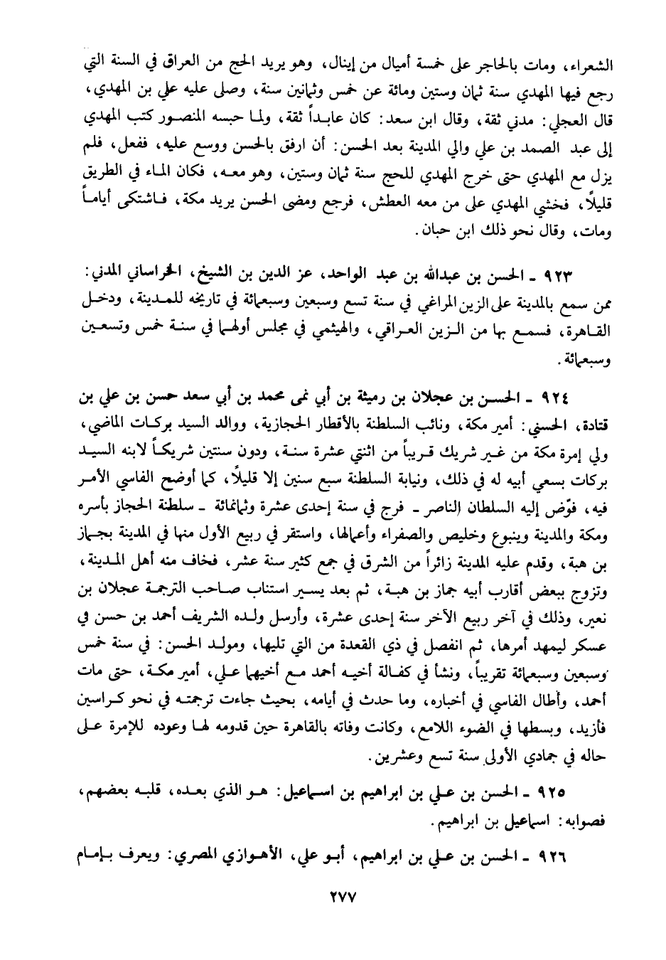 924 - الحسن بن عجلان بن رميثة بن أبي نمى محمد بن أبي سعد حسن بن علي بن قتادة الحسني أمير مكة ونائب السلطنة بالأقطار الحجازية ووالد السيد بركات الماضي ولي إمرة مكة من غير شريك قريبا من اثنتي عشرة سنة ودون سنتين شريكا لابنه السيد بركات بسعي أبيه له في ذلك ونيابة السلطنة سبع سنين إلا قليلا كما أوضح الفاسي الأمر فيه فوض إليه السلطان الناصر فرج في سنة إحدى عشرة وثمانمائة سلطنة الحجاز بأسره ومكة والمدينة وينبوع وخليص والصفراء وأعمالها واستقر في ربيع الأول منها في المدينة بجماز بن هبة وقدم عليه المدينة زائرا من الشرق في جمع كثير سنة عشر فخاف منه أهل المدينة وتزوج ببعض أقارب أبيه جماز بن هبة ثم بعد يسير استناب صاحب الترجمة عجلان بن نعير وذلك في آخر ربيع الآخر سنة إحدى عشرة وأرسل ولده الشريف أحمد بن حسن في عسكر ليمهد أمرها ثم انفصل في ذي القعدة من التي تليها ومولد الحسن في سنة خمس وسبعين وسبعمائة تقريبا ونشأ في كفالة أخيه أحمد مع أخيهما علي أمير مكة حتى مات أحمد وأطال الفاسي في أخباره وما حدث في أيامه بحيث جاءت ترجمته في نحو كراسين فأزيد وبسطها في الضوء اللامع وكانت وفاته بالقاهرة حين قدومه لها وعوده للإمرة على حاله في جمادي الأولى سنة تسع وعشرين.