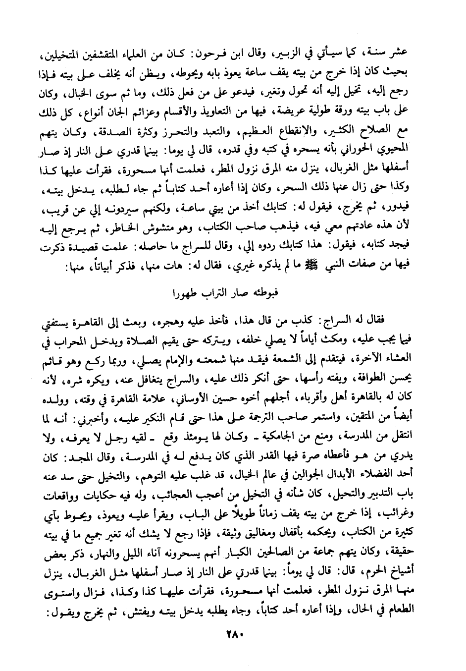 عشر سنة كما سيأتي في الزبير وقال ابن فرحون كان من العلماء المتقشفين المتخيلين بحيث كان إذا خرج من بيته يقف ساعة يعوذ بابه ويحوطه ويظن أنه يخلف على بيته فإذا رجع إليه تخيل إليه أنه تحول وتغير فيدعو على من فعل ذلك وما ثم سوى الخبال وكان على باب بيته ورقة طولية عريضة فيها من التعاويذ والأقسام وعزائم الجان أنواع كل ذلك مع الصلاح الكثير والانقطاع العظيم والتعبد والتحرز وكثرة الصدقة وكان يتهم المحيوي الحوراني بأنه يسحره في كتبه وفي قدره قال لي يوما بينما قدري على النار إذ صار أسفلها مثل الغربال ينزل منه المرق نزول المطر فعلمت أنها مسحورة فقرأت عليها كذا وكذا حتى زال عنها ذلك السحر وكان إذا أعاره أحد كتابا ثم جاء لطلبه يدخل بيته فيدور ثم يخرج فيقول له كتابك أخذ من بيتي ساعة ولكنهم سيردونه إلي عن قريب لأن هذه عادتهم معي فيه فيذهب صاحب الكتاب وهو متشوش الخاطر ثم يرجع إليه فيجد كتابه فيقول هذا كتابك ردوه إلي وقال السراج ما حاصله علمت قصيدة ذكرت فيها من صفات النبي صلى الله عليه وسلم ما لم يذكر غيري فقال له هات منها فذكر أبياتا منها: