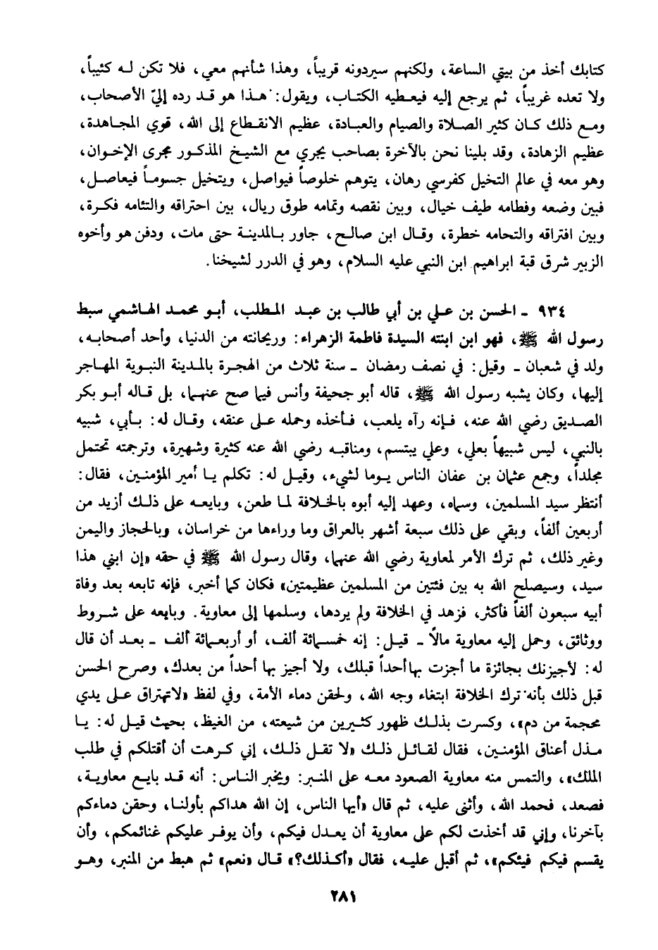 934 - الحسن بن علي بن أبي طالب بن عبد المطلب أبو محمد الهاشمي سبط رسول الله صلى الله عليه وسلم فهو ابن ابنته السيدة فاطمة الزهراء وريحانته من الدنيا وأحد أصحابه ولد في شعبان وقيل في نصف رمضان سنة ثلاث من الهجرة بالمدينة النبوية المهاجر إليها وكان يشبه رسول الله صلى الله عليه وسلم قاله أبو جحيفة وأنس فيما صح عنهما بل قاله أبو بكر الصديق رضي الله عنه فإنه رآه يلعب فأخذه وحمله على عنقه وقال له بأبي شبيه بالنبي ليس شبيها بعلي وعلي يبتسم ومناقبه رضي الله عنه كثيرة وشهيرة وترجمته تحتمل مجلدا وجمع عثمان بن عفان الناس يوما لشيء وقيل له تكلم يا أمير المؤمنين فقال أنتظر سيد المسلمين وسماه وعهد إليه أبوه بالخلافة لما طعن وبايعه على ذلك أزيد من أربعين ألفا وبقي على ذلك سبعة أشهر بالعراق وما وراءها من خراسان وبالحجاز واليمن وغير ذلك ثم ترك الأمر لمعاوية رضي الله عنهما وقال رسول الله صلى الله عليه وسلم في حقه "إن ابني هذا سيد وسيصلح الله به بين فئتين من المسلمين عظيمتين" فكان كما أخبر فإنه تابعه بعد وفاة أبيه سبعون ألفا فأكثر فزهد في الخلافة ولم يردها وسلمها إلى معاوية وبايعه على شروط ووثائق وحمل إليه معاوية مالا قيل إنه خمسمائة ألف أو أربعمائة ألف بعد أن قال له لأجيزنك بجائزة ما أجزت بها أحد قبلك ولا أجيز بها أحدا من بعدك وصرح الحسن قبل ذلك بأنه ترك الخلافة ابتغاء وجه الله ولحقن دماء الأمة وفي لفظ لاتهتراق على يدي محجمة من دم وكسرت بذلك ظهور كثيرين من شيعته من الغيظ بحيث قيل له يا مذل أعناق المؤمنين فقال لقائل ذلك لا تقل ذلك إني كرهت أن أقتلكم في طلب الملك والتمس منه معاوية الصعود معه على المنبر ويخبر الناس أنه قد بايع معاوية فصعد فحمد الله وأثنى عليه ثم قال أيها الناس إن الله هداكم بأولنا وحقن دماءكم بآخرنا وإني قد أخذت لكم على معاوية أن يعدل فيكم وأن يوفر عليكم غنائمكم وأن يقسم فيكم فيئكم ثم أقبل عليه فقال أكذلك قال نعم ثم هبط من المنبر وهو