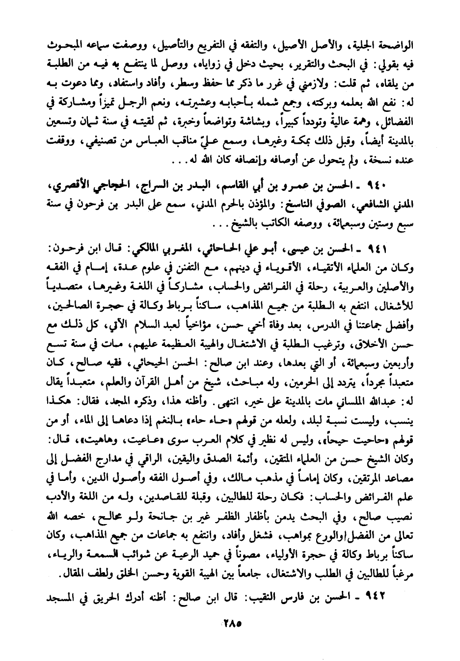 941 - الحسن بن عيسى أبو علي الحاحائي المغربي المالكي قال ابن فرحون وكان من العلماء الأتقياء الأقوياء في دينهم مع التفنن في علوم عدة إمام في الفقه والأصلين والعربية رحلة في الفرائض والحساب مشاركا في اللغة وغيرها متصديا للأشغال انتفع به الطلبة من جميع المذاهب ساكنا برباط وكالة في حجرة الصالحين وأفضل جماعتنا في الدرس بعد وفاة أخي حسن مؤاخيا لعبد السلام الآتي كل ذلك مع حسن الأخلاق وترغيب الطلبة في الاشتغال والهيبة العظيمة عليهم مات في سنة تسع وأربعين وسبعمائة أو التي بعدها وعند ابن صالح الحسن الحيحائي فقيه صالح كان متعبدا مجردا يتردد إلى الحرمين وله مباحث شيخ من أهل القرآن والعلم متعبدا يقال له عبد الله الملساني مات بالمدينة على خير انتهى وأظنه هذا وذكره المجد فقال هكذا ينسب وليست نسبة لبلد ولعله من قولهم حاء حاء بالنغم إذا دعاها إلى الماء أو من قولهم حاحيت حيحا وليس له نظير في كلام العرب سوى عاعيت وهاهيت قال وكان الشيخ حسن من العلماء المتقين وأئمة الصدق واليقين الراقي في مدارج الفضل إلى مصاعد المرتقين وكان إماما في مذهب مالك وفي أصول الفقه وأصول الدين وأما في علم الفرائض والحساب فكان رحلة للطالبين وقبلة للقاصدين وله من اللغة والأدب نصيب صالح وفي البحث يدمن بأظفار الظفر غير بن جانحة ولو محالح خصه الله تعالى من الفضل والورع بمواهب فشغل وأفاد وانتفع به جماعات من جميع المذاهب وكان ساكنا برباط وكالة في حجرة الأولياء مصونا في حميد الرعية عن شوائب السمعة والرياء مرغبا للطالبين في الطلب والاشتغال جامعا بين الهيبة القوية وحسن الخلق ولطف المقال.