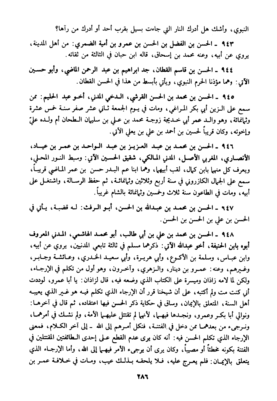 948 - الحسن بن محمد بن علي بن أبي طالب أبو محمد الهاشمي المدني المعروف أبوه بابن الحنيفة أخوعبد الله الآتي ذكرهما مسلم في ثالثة تابعي المدنيين يروي عن أبيه وابن عباس وسلمة بن الأكوع وأبي هريرة وأبي سعيد الخدري وعائشة وجابر وغيرهم وعنه عمرو بن دينار والزهري وآخرون وهو أول من تكلم في الإرجاء ولكن لما لامه زاذان وميسرة على الكتاب الذي وضعه فيه قال لزاذان يا أبا عمرو لوددت أني كنت مت ولم أكتبه على أن شيخنا قرر أن الإرجاء الذي تكلم فيه هو غير الذي يعيبه أهل السنة المتعلق بالإيمان وساق في حكاية ذكر الحسن فيها اعتقاده ثم قال في آخرها ونوالي أبا بكر وعمرو ونجدها فيهما لأنهما لم تقتتل عليهما الأمة ولم نشك في أمرهما ونرجىء من بعدهما ممن دخل في الفتنة فنكل أمرهم إلى الله إلى آخر الكلام فمعنى الإرجاء الذي تكلم الحسن فيه أنه كان يرى عدم القطع على إحدى الطائفتين المقتتلين في الفتنة بكونه مخطئا أو مصيبا وكان يرى أن يرجىء الأمر فيهما إلى الله وأما الإرجاء الذي يتعلق بالإيمان فلم يعرج عليه فلا يلحقه بذلك عيب ومات في خلافة عمر بن