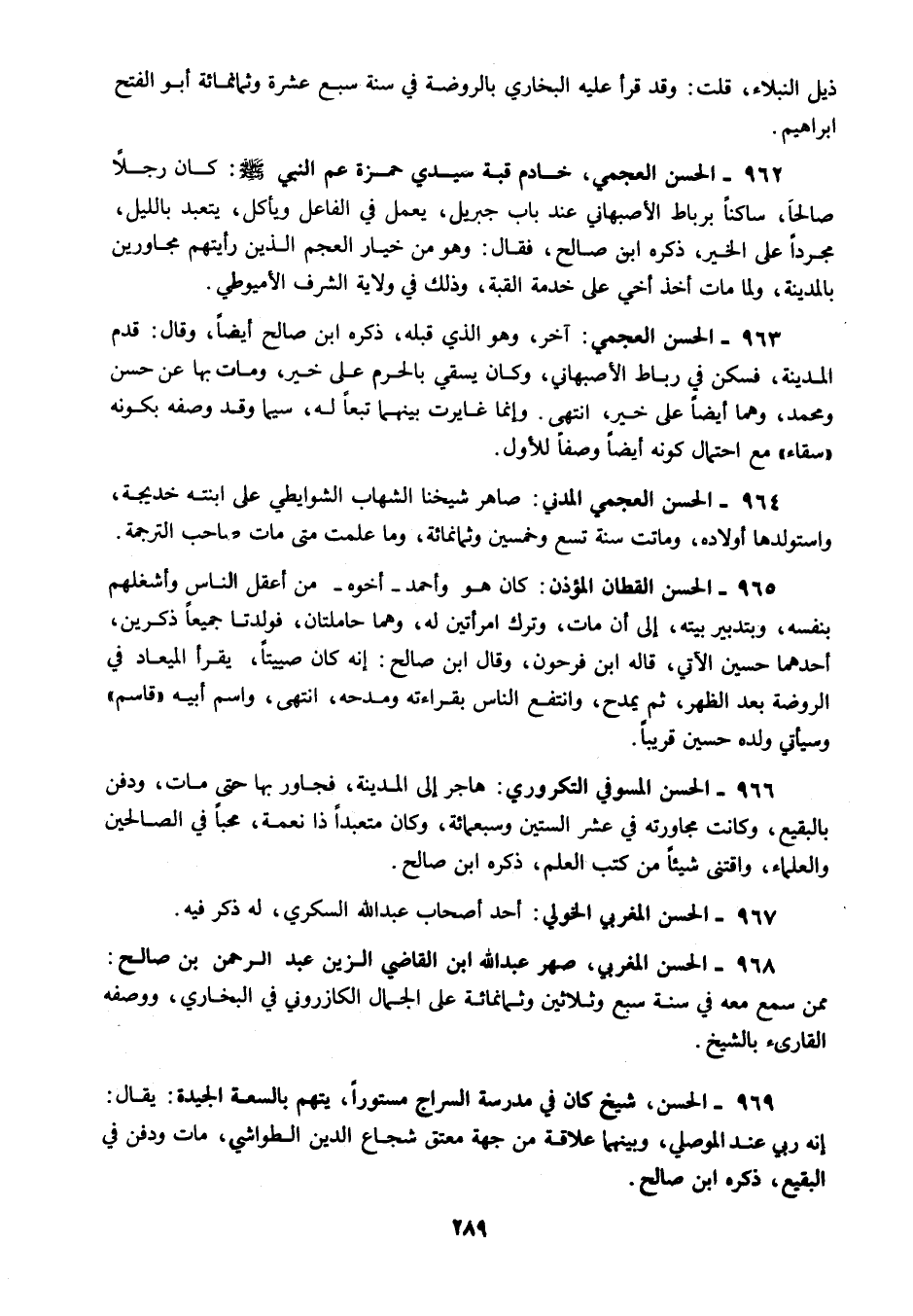 962 - الحسن العجمي خادم قبة سيدي حمزة عم النبي صلى الله عليه وسلم كان رجلا صالحا ساكنا برباط الأصبهاني عند باب جبريل يعمل في الفاعل ويأكل يتعبد بالليل مجردا على الخير ذكره ابن صالح فقال وهو من خيار العجم الذين رأيتهم مجاورين بالمدينة ولما مات أخذ أخي على خدمة القبة وذلك في ولاية الشرف الأميوطي.