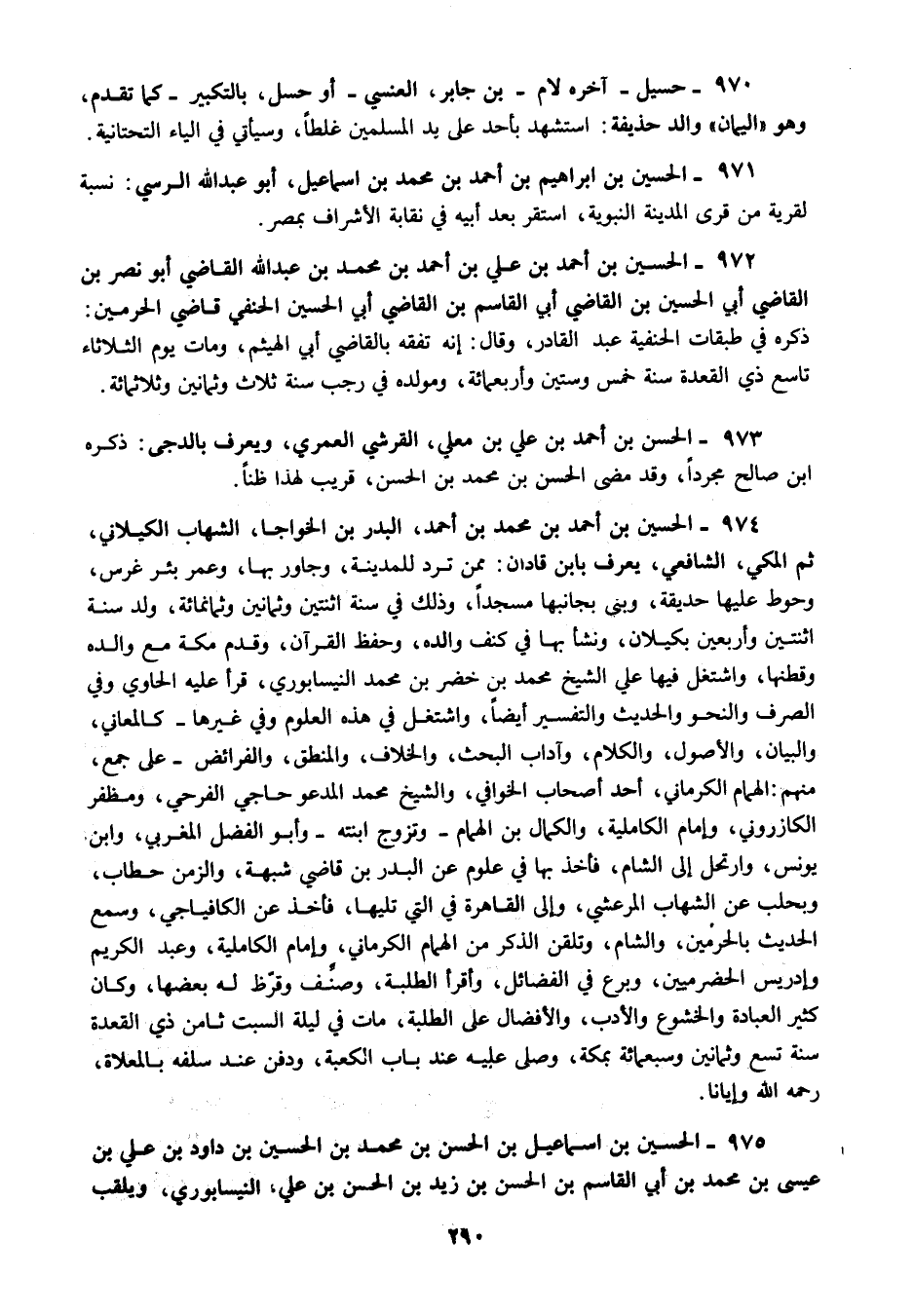 972 - الحسين بن أحمد بن علي بن أحمد بن محمد بن عبد الله القاضي أبو نصر بن القاضي أبي الحسين بن القاضي أبي القاسم بن القاضي أبي الحسين الحنفي قاضي الحرمين ذكره في طبقات الحنفية عبد القادر وقال إنه تفقه بالقاضي أبي الهيثم ومات يوم الثلاثاء تاسع ذي القعدة سنة خمس وستين وأربعمائة ومولده في رجب سنة ثلاث وثمانين وثلاثمائة.