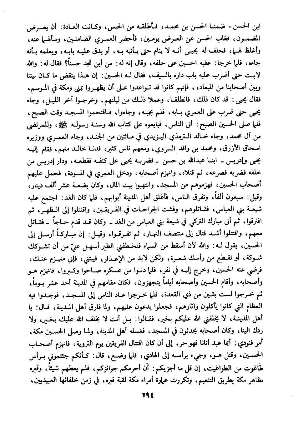 ابن الحسن ضمنا الحسن بن محمد فأطلقه من الحبس وكانت العادة أن يعرض المضمون فغاب الحسن عن العرض يومين فأحضر العمري الضامنين وسألهما عنه وأغلظ لهما فحلف له يحيى أنه لا ينام حتى يأتيه به أو يدق عليه بابه ويعلمه بأنه جاءه فلما خرجا عقبه الحسين على حلفه وقال إنه له من أين تجد حسنا فقال له والله لابت حتى أضرب عليه باب داره بالسيف فقال له الحسين إن هذا ينقض ما كان بيننا وبين أصحابنا من الميعاد فإنهم كانوا قد تواعدوا على أن يظهروا بمنى ومكة في الموسم فقال يحيى قد كان ذلك فانطلقا وعملا ذلك من ليلتهم وخرجوا آخر الليل وجاء يحيى حتى ضرب على العمري بابه فلم يجبه وجاءوا فاقتحموا المسجد وقت الصبح فلما صلى الحسين الصبح أتى الناس فبايعوه على كتاب الله وسنة رسوله صلى الله عليه وسلم وللمترضى من آل محمد وجاء خالد الترمذي اليزيدي في مائتين من الجند وجاء العمري ووزيره إسحاق الأزرق ومحمد بن واقد السروي ومعهم ناس كثير فدنا خالد منهم فقام إليه يحيى وإدريس ابنا عبد الله بن حسن فضربه يحيى على كتفه فقطعه ودار إدريس من خلفه فضربه فصرعه ثم قتلاه وانهزم أصحابه ودخل العمري في المسودة فحمل عليهم أصحاب الحسين فهزموهم من المسجد وانتهبوا بيت المال وكان بضعة عشر ألف دينار وقيل سبعون ألفا وتفرق الناس فأغلق أهل المدينة أبوابهم فلما كان الغد اجتمع عليه شيعة بني العباس فقاتلوهم وفشت الجراحات في الفريقين واقتتلوا إلى الظهر ثم افترقوا ثم أتى مبارك التركي في شيعة بني العباس من الغد وكان قد قدم حاجا فقاتل معهم واقتتلوا أشد قتال إلى منتصف النهار ثم تفرقوا وقيل إن مباركا أرسل إلى الحسين يقول له والله لأن أسقط من السماء فتخطفني الطير أسهل علي من أن تشوكك شوكة أو تقطع من رأسك شعرة ولكن لا بد من الإعذار فيبتني فإني منهزم عنك فرضي عنه الحسين وخرج إليه في نفر فلما دنوا من عسكره صاحوا وكبروا فانهزم هو وأصحابه وأقام الحسين وأصحابه أياما يتجهزون فكان مقامهم في المدينة أحد عشر يوما ثم خرجوا لست بقين من ذي القعدة فلما خرجوا عاد الناس إلى المسجد فوجدوا فيه العظام التي كانوا يأكلون وآثارهم فجعلوا يدعون عليهم ولما فارق أهل المدينة قال يا أهل المدينة لا يخلفني الله عليكم بخير فقالوا بل أنت لا يخلف الله عليك بخير ولا ردك الينا وكان أصحابه يحدثون في المسجد فغسله أهل المدينة ولما وصل الحسين مكة أمر فنودي أيما عبد أتانا فهو حر إلى أن كان اقتتال الفريقين يوم التروية فانهزم أصحاب الحسين وقتل هو وجيء برأسه إلى الهادي فلما وضع قال كأنكم جئتموني برأس طاغوت من الطواغيت إن قل ما أجزيكم أن أحرمكم جوائزكم فلم يعطهم شيئا وقبره بظاهر مكة بطريق التنعيم وتكررت عمارة أمراء مكة لقبة قبره في زمن خلفائها العبيديين