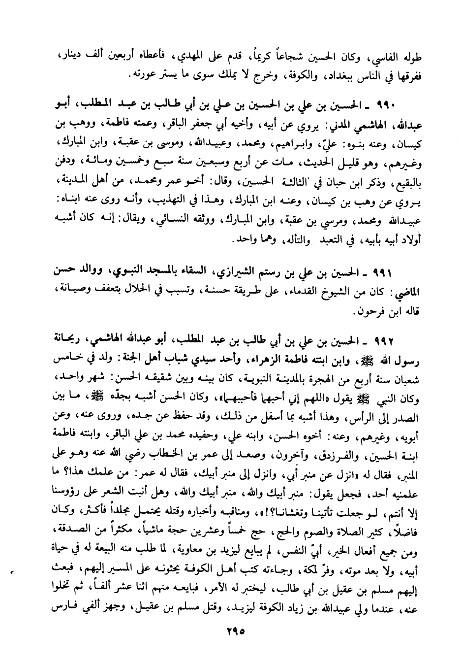992 - الحسين بن علي بن أبي طالب بن عبد المطلب أبو عبد الله الهاشمي ريحانة رسول الله صلى الله عليه وسلم وابن ابنته فاطمة الزهراء وأحد سيدي شباب أهل الجنة ولد في خامس شعبان سنة أربع من الهجرة بالمدينة النبوية كان بينه وبين شقيقه الحسن شهر واحد وكان النبي صلى الله عليه وسلم يقول "اللهم إني أحبهما فأحببهما" وكان الحسن أشبه بجده صلى الله عليه وسلم ما بين الصدر إلى الرأس وهذا أشبه بما أسفل من ذلك وقد حفظ عن جده وروى عنه وعن أبويه وغيرهم وعنه أخوه الحسن وابنه علي وحفيده محمد بن علي الباقر وابنته فاطمة ابنة الحسين والفرزدق وآخرون وصعد إلى عمر بن الخطاب رضي الله عنه وهو على المنبر فقال له انزل عن منبر أبي وانزل إلى منبر أبيك فقال له عمر من علمك هذا؟ ما علمنيه أحد فجعل يقول منبر أبيك والله منبر أبيك والله وهل أنبت الشعر على رؤسنا إلا أنتم لو جعلت تأتينا وتغشانا؟! " ومناقبه وأخباره وقتله يحتمل مجلدا فأكثر وكان فاضلا كثير الصلاة والصوم والحج حج خمسا وعشرين حجة ماشيا مكثرا من الصدقة ومن جميع أفعال الخير أبي النفس لم يبايع ليزيد بن معاوية لما طلب منه البيعة له في حياة أبيه ولا بعد موته وفر لمكة وجاءته كتب أهل الكوفة يحثونه على المسير إليهم فبعث إليهم مسلم بن عقيل بن أبي طالب ليختبر له الأمر فبايعه منهم اثنا عشر ألفا ثم تخلوا عنه عندما ولي عبيد الله بن زياد الكوفة ليزيد وقتل مسلم بن عقيل وجهز ألفي فارس