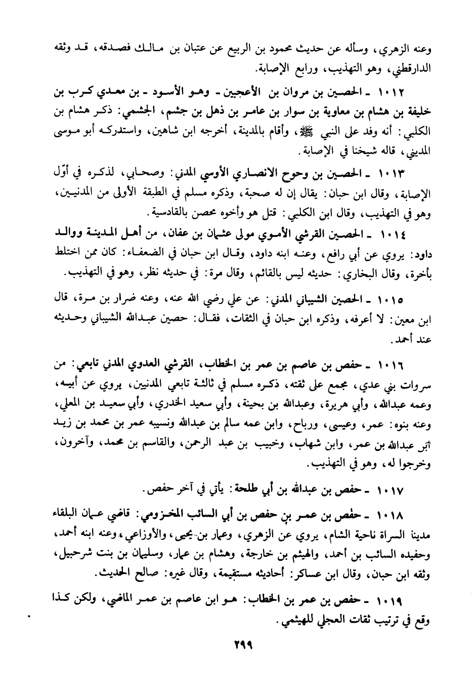 1019 - حفص بن عمر بن الخطاب هو ابن عاصم بن عمر الماضي ولكن كذا وقع في ترتيب ثقات العجلي للهيثمي