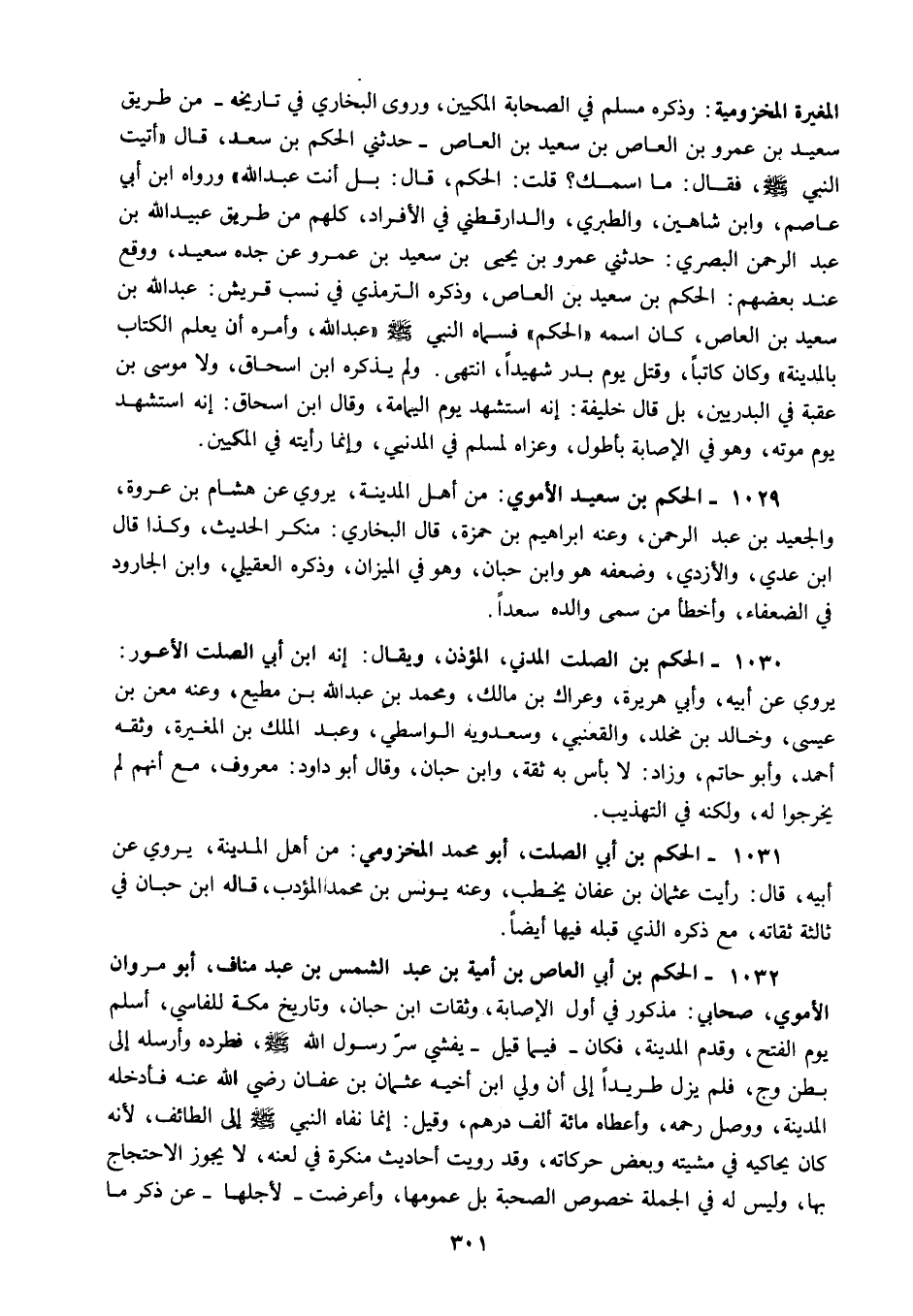 1032 - الحكم بن أبي العاص بن أمية بن عبد الشمس بن عبد مناف أبو مروان الأموي صحابي مذكور في أول الإصابة وثقات ابن حبان وتاريخ مكة للفاسي أسلم يوم الفتح وقدم المدينة فكان فيما قيل يفشي سر رسول الله صلى الله عليه وسلم فطرده وأرسله إلى بطن وج فلم يزل طريدا إلى أن ولي ابن أخيه عثمان بن عفان رضي الله عنه فأدخله المدينة ووصل رحمه وأعطاه مائة ألف درهم وقيل إنما نفاه النبي صلى الله عليه وسلم إلى الطائف لأنه كان يحاكيه في مشيته وبعض حركاته وقد رويت أحاديث منكرة في لعنه لا يجوز الاحتجاج بها وليس له في الجملة خصوص الصحبة بل عمومها وأعرضت – لأجلها - عن ذكر ما
