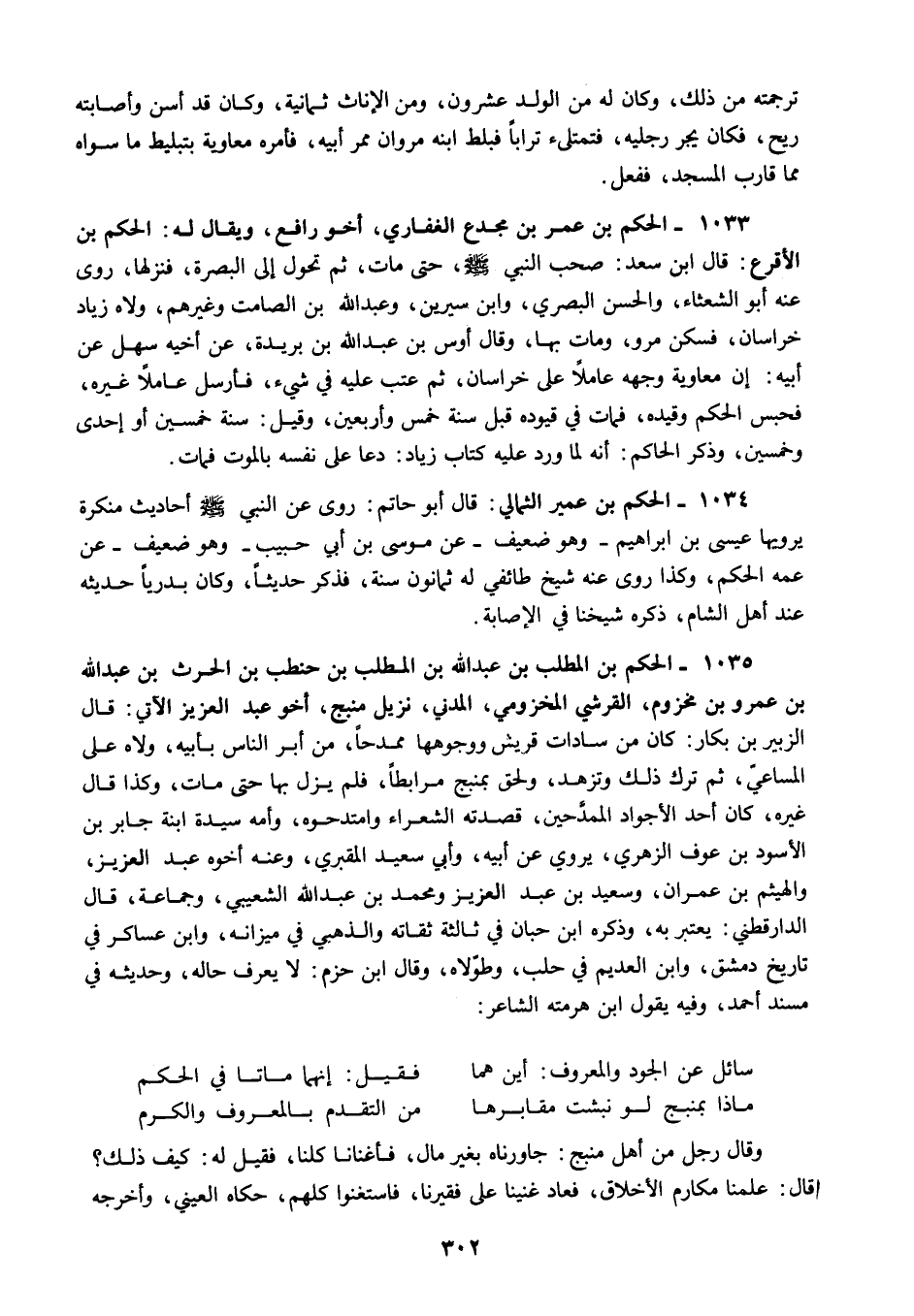 1035 - الحكم بن المطلب بن عبد الله بن المطلب بن حنطب بن الحرث بن عبد الله بن عمرو بن مخزوم القرشي المخوزمي المدني نزيل منبج أخو عبد العزيز الآتي قال الزبير بن بكار كان من سادات قريش ووجوهها ممدحا من أبر الناس بأبيه ولاه على المساعي ثم ترك ذلك وتزهد ولحق بمنبج مرابطا فلم يزل بها حتى مات وكذا قال غيره كان أحد الأجواد الممدحين قصدته الشعراء وامتدحوه وأمه سيدة ابنة جابر بن الأسود بن عوف الزهري يروي عن أبيه وأبي سعيد المقبري وعنه أخوه عبد العزيز والهيثم بن عمران وسعيد بن عبد العزيز ومحمد بن عبد الله الشعيبي وجماعة قال الدارقطني يعتبر به وذكره ابن حبان في ثالثة ثقاته والذهبي في ميزاته وابن عساكر في تاريخ دمشق وابن العديم في حلب وطولاه وقال ابن حزم لا يعرف حاله وحديثه في مسند أحمد وفيه يقول ابن هرمته الشاعر: