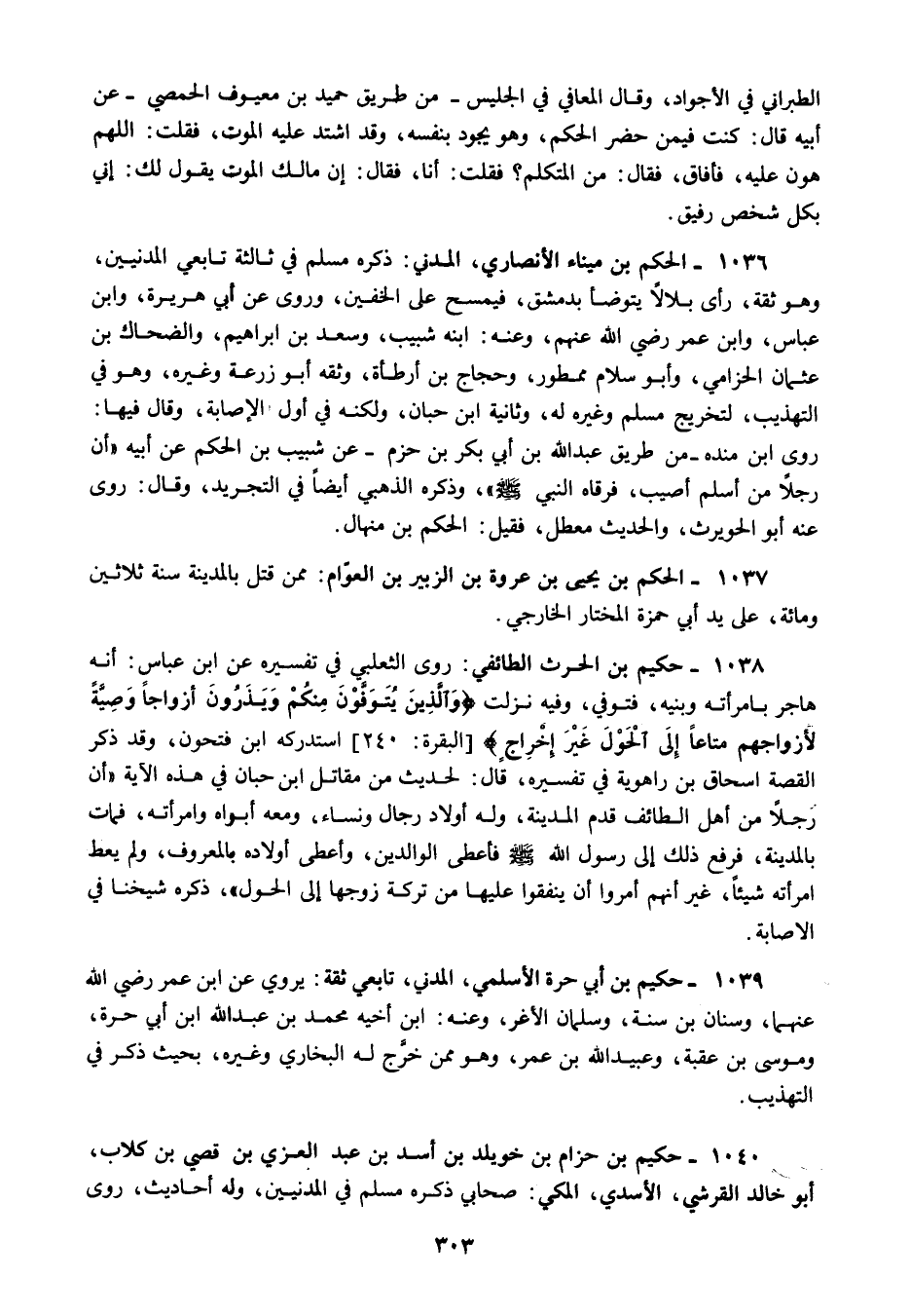 1038 - حكيم بن الحرث الطائفي روى الثعلبي في تفسيره عن ابن عباس أنه هاجر بامرأته وبنيه فتوفي وفيه نزلت: {وَالَّذِينَ يُتَوَفَّوْنَ مِنْكُمْ وَيَذَرُونَ أَزْوَاجاً وَصِيَّةً لِأَزْوَاجِهِمْ مَتَاعاً إِلَى الْحَوْلِ غَيْرَ إِخْرَاجٍ} البقرة 240 استدركه ابن فتحون وقد ذكر القصة إسحاق بن راهوية في تفسيره قال لحديث من مقاتل ابن حبان في هذه الآية أن رجلا من أهل الطائف قدم المدينة وله أولاد رجال ونساء ومعه أبواه وامرأته فمات بالمدينة فرفع ذلك إلى رسول الله صلى الله عليه وسلم فأعطى الوالدين وأعطى أولاده بالمعروف ولم يعط امرأته شيئا غير أنهم أمروا أن ينفقوا عليها من تركة زوجها إلى الحول ذكره شيخنا في الإصابة.