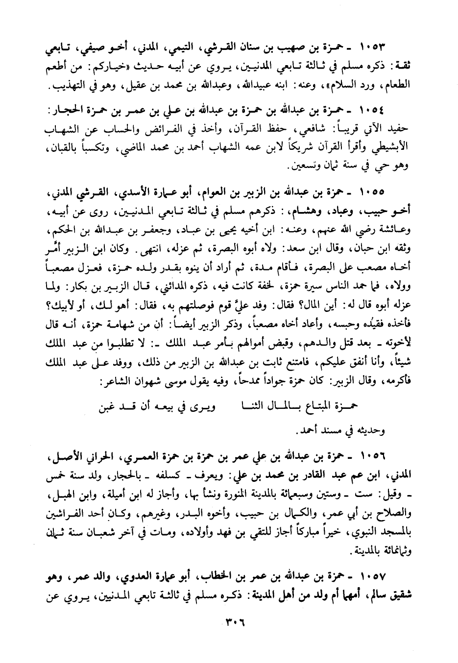1055 - حمزة بن عبد الله بن الزبير بن العوام أبو عمارة الأسدي القرشي المدني أخو حبيب وعباد وهشام ذكرهم مسلم في ثالثة تابعي المدنيين روى عن أبيه وعائشة رضي الله عنهم وعنه ابن أخيه يحيى بن عباد وجعفر بن عبد الله بن الحكم وثقه ابن حبان وقال ابن سعد ولاه أبوه البصرة ثم عزله انتهى وكان ابن الزبير أمر أخاه مصعب على البصرة فأقام مدة ثم أراد أن ينوه بقدر ولده حمزة فعزل مصعبا وولاه فما حمد الناس سيرة حمزة لخفة كانت فيه ذكره المدائني قال الزبير بن بكار ولما عزله أبوه قال له أين المال فقال وفد علي قوم فوصلتهم به فقال أهو لك أو لأبيك فأخذه فقيده وحبسه وأعاد أخاه مصعبا وذكر الزبير أيضا أن من شهامة حمزة أنه قال لأخوته بعد قتل والدهم وقبض أموالهم بأمر عبد الملك لا تطلبوا من عبد الملك شيئا وأنا أنفق عليكم فامتنع ثابت بن عبد الله بن الزبير من ذلك ووفد على عبد الملك فأكرمه وقال الزبير كان حمزة جوادا ممدحا وفيه يقول موسى شهوان الشاعر: