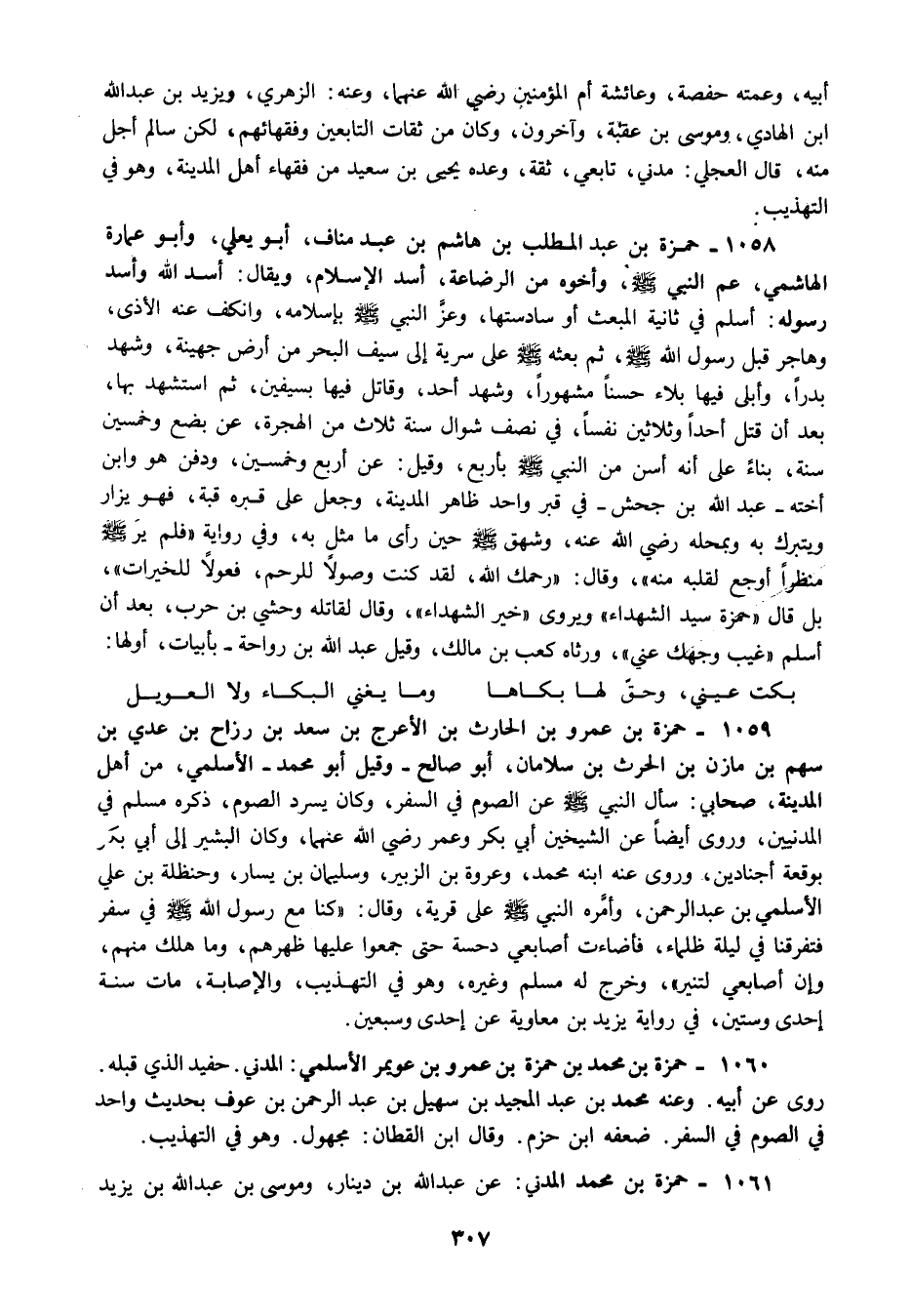 1058 - حمزة بن عبد المطلب بن هاشم بن عبد مناف أبو يعلي وأبو عمارة الهاشمي عم النبي صلى الله عليه وسلم وأخوه من الرضاعة أسد الإسلام ويقال أسد الله وأسد رسوله أسلم في ثانية المبعث أو سادستها وعز النبي صلى الله عليه وسلم بإسلامه وانكف عنه الأذى وهاجر قبل رسول الله صلى الله عليه وسلم ثم بعثه صلى الله عليه وسلم على سرية إلى سيف البحر من أرض جهينة وشهد بدرا وأبلى فيها بلاء حسنا مشهورا وشهد أحد وقاتل فيها بسيفين ثم استشهد بها بعد أن قتل أحدا وثلاثين نفسا في نصف شوال سنة ثلاث من الهجرة عن بضع وخمسين سنة بناء على أنه أسن من النبي صلى الله عليه وسلم بأربع وقيل عن أربع وخمسين ودفن هو وابن أخته عبد الله بن جحش في قبر واحد ظاهر المدينة وجعل على قبره قبة فهو يزار ويتبرك به وبمحله رضي الله عنه وشهق صلى الله عليه وسلم حين رأى ما مثل به وفي رواية "فلم ير صلى الله عليه وسلم منظرا أوجع لقلبه منه" وقال "رحمك الله لقد كنت وصولا للرحم فعولا للخيرات" بل قال "حمزة سيد الشهداء" ويروى "خير الشهداء" وقال لقاتله وحشي بن حرب بعد أن أسلم غيب وجهك عني ورثاه كعب بن مالك وقيل عبد الله بن رواحة بأبيات أولها: