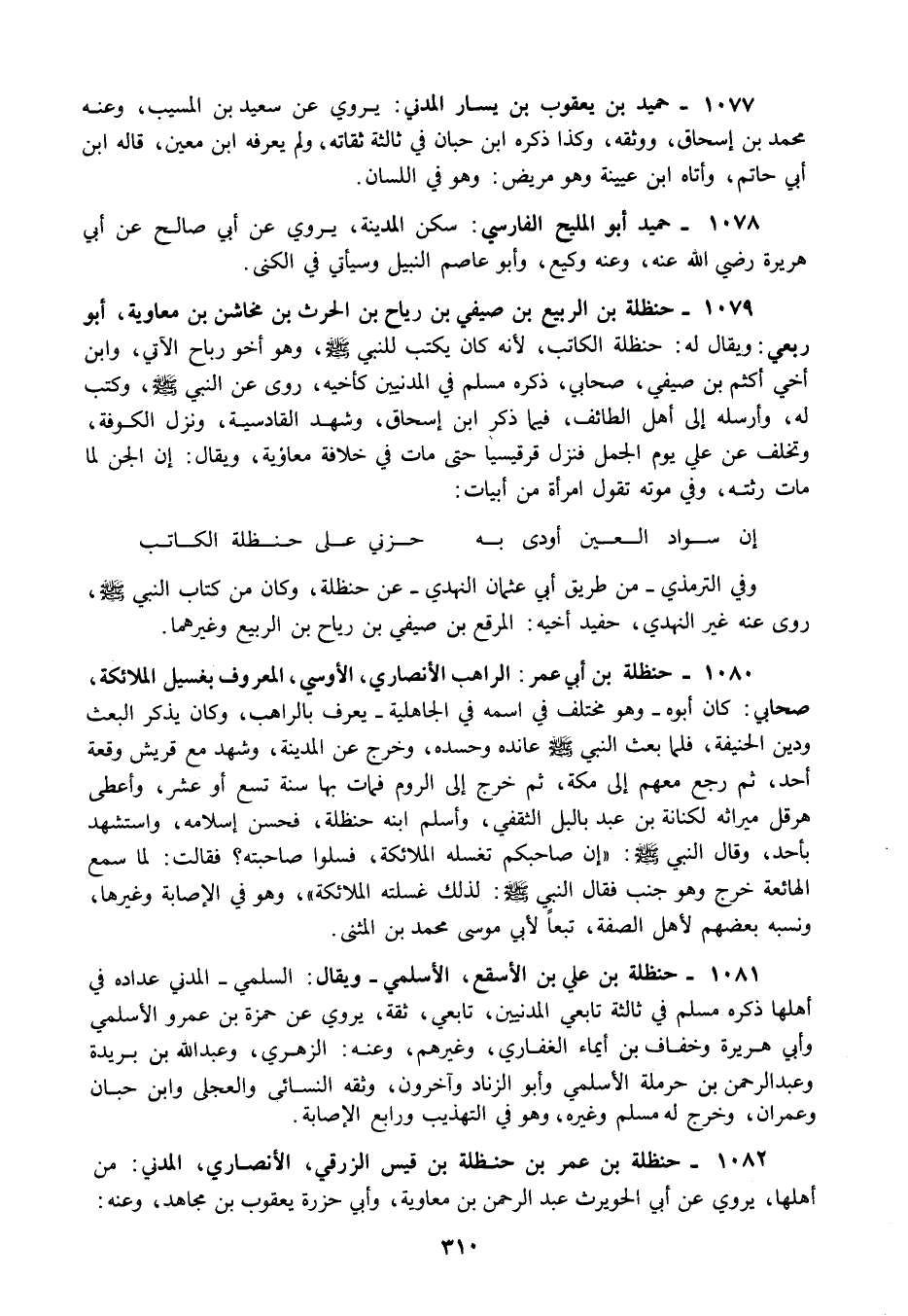 1080 - حنظلة بن أبي عمر الراهب الأنصاري الأوسي المعروف بغسيل الملائكة صحابي كان أبوه وهو مختلف في اسمه في الجاهلية يعرف بالراهب وكان يذكر البعث ودين الحنيفة فلما بعث النبي صلى الله عليه وسلم عانده وحسده وخرج عن المدينة وشهد مع قريش وقعة أحد ثم رجع معهم إلى مكة ثم خرج إلى الروم فمات بها سنة تسع أوعشر وأعطى هرقل ميراثه لكنانة بن عبد بالبل الثقفي وأسلم ابنه حنظلة فحسن إسلامه واستشهد بأحد وقال النبي صلى الله عليه وسلم: "إن صاحبكم تغسله الملائكة فسلوا صاحبته" فقالت لما سمع الهائعة خرج وهو جنب فقال النبي صلى الله عليه وسلم "لذلك غسلته الملائكة" وهو في الإصابة وغيرها ونسبه بعضهم لأهل الصفة تبعا لأبي موسى محمد بن المثنى.