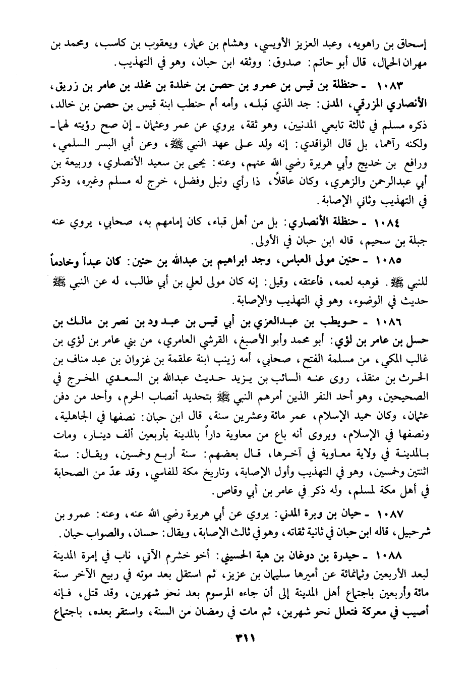 1085 - حنين مولى العباس وجد إبراهيم بن عبد الله بن حنين كان عبدا وخادما للنبي صلى الله عليه وسلم فوهبه لعمه فأعتقه وقيل إنه كان مولى لعلي بن أبي طالب له عن النبي صلى الله عليه وسلم حديث في الوضوء وهو في التهذيب والإصابة.