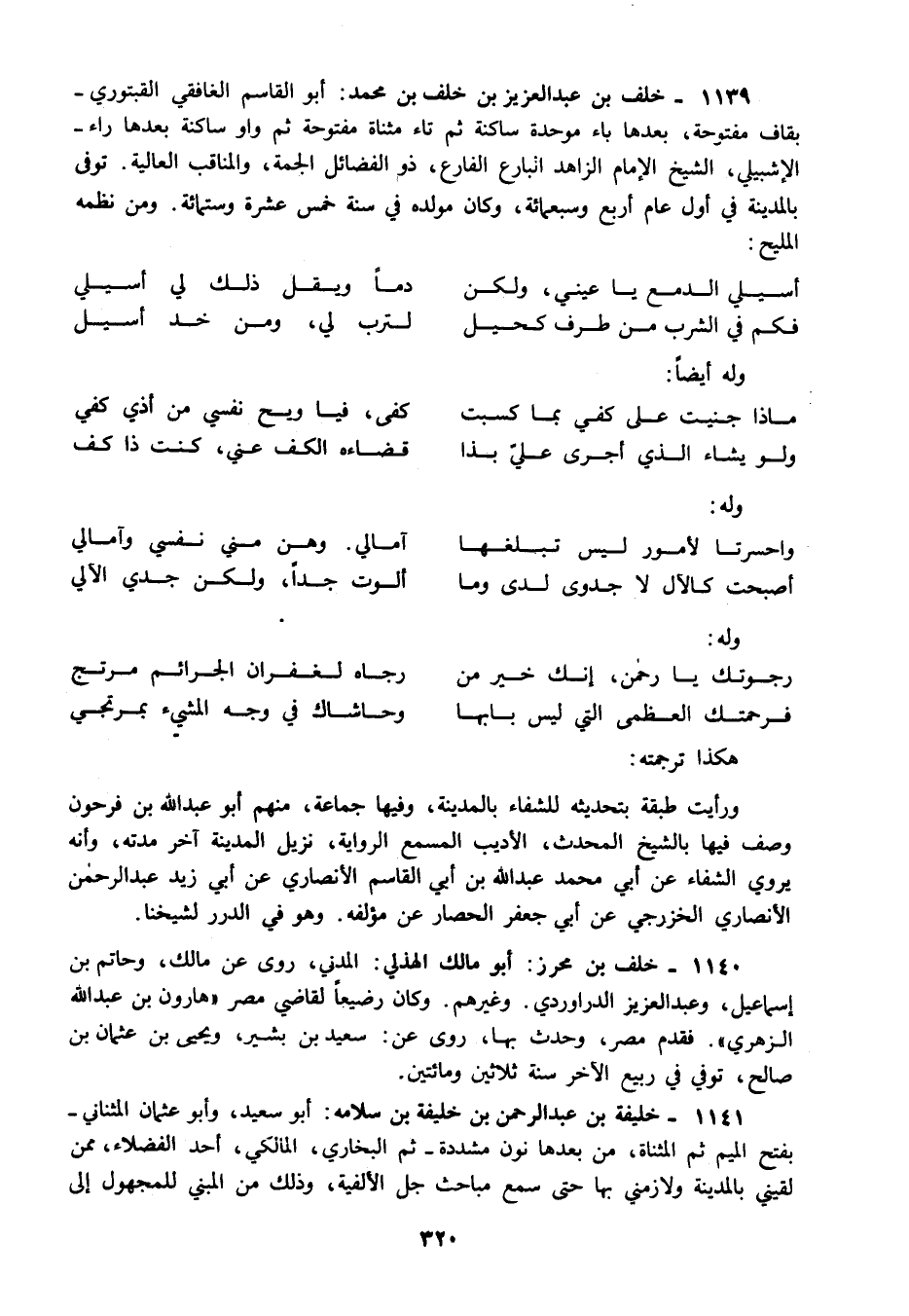 1139 - خلف بن عبد العزيز بن خلف بن محمد أبو القاسم الغافقي القبتوري بقاف مفتوحة بعدها باء موحدة ساكنة ثم تاء مثناة مفتوحة ثم واو ساكنة بعدها راء الإشبيلي الشيخ الإمام الزاهد البارع الفارع ذو الفضائل الجمة والمناقب العالية توفى بالمدينة في أول عام أربع وسبعمائة وكان مولده في سنة خمس عشرة وستمائة ومن نظمه المليح: