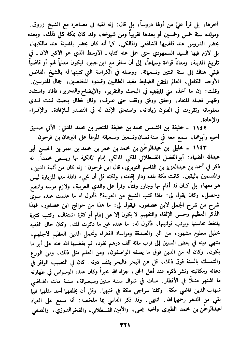 1143 - خليل بن عبد الرحمن بن محمد بن عمر بن محمد بن عمر بن الحسن أبو عبد الله الضياء أبو الفضل القسطلاني المكي المالكي إمام المالكية بها ويسمى محمدا له ذكر في أحمد بن عبد العزيز بن القاسم النويري قال ابن فرحون إنه كان من أئمة الدين والمتسمين باليقين كانت مكة بلده ودار إقامته ولكنه قل أن تجيء قافلة منها للزيارة ليس هو معها بل كان قد أقام بها وجاور وقتا وقرأ على والدي العربية ولازم درسه وانتفع وحصل وكان يقول لي ماذا كتب الشيخ من العربية فأقول له ما علمت عنده سوى شرح من شرح الجمل لابن عصفور فيقول لي ما هذا من حوائج ابن عصفور فهذا الذكر العظيم وحسن الإلقاء والتفهيم لا يكون إلا عن إلهام او كثرة اشتغال وكتب كثيرة يلتقط محاسنها ويرتب قوانينها فأقول له ما عنده غير ما ذكرت لك وكان حال الفقيه خليل معلوم مشهور من البر والصدقة ومواساة الفقراء وتحمل الدين العظيم لأجلهم ينتهي دينه في بعض السنين إلى قرب مائة ألف درهم نقود ثم يقضيها الله عنه على أبر ما يكون وكان له من الدين فوق ما يصفه الوصفون ومن العلم مثل ذلك ومن الورع والتمسك بالسنة فوق ذلك قل عن البحر فالبحر يقف دونه كان لي النصيب الوافر في دعائه ومكاتبته ونشر ذكره عند أهل الخير جزاه الله خيرا وكان عنده الوسواس في طهارته ما اشتهر مثلا في الأقطار مات في شوال سنة ستين وسبعمائة سنة مات القاضي شهاب الدين قاضي مكة وكلنا سراجى مكة في فنيهما وقل أن يخلفهما أحد مثلهما فيما بقي من الدهر رحمهما الله انتهى وقد ذكر الفاسي بما ملخصه أنه سمع على العماد عبد الرحمن بن محمد الطبري وأخيه يحيى والأمين القسطلاني والفخر التوزي والصفي