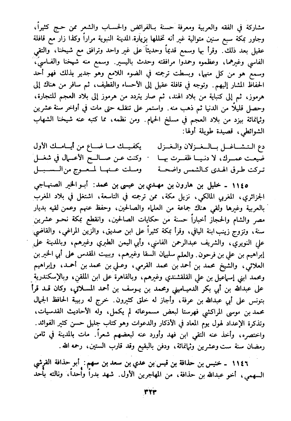 1145 - خليل بن هارون بن مهدي بن عيسى بن محمد أبو الخير الصنهاجي الجزائري المغربي المالكي نزيل مكة ممن ترجمته في التاسعة اشتغل في بلاد المغرب بالعربية وغيرها ولقي هناك جماعة من العلماء والصالحين وحفظ عنهم وعمن لقيه بديار مصر والشام والحجاز أخبارا حسنة من حكايات الصالحين وانقطع بمكة نحو عشرين سنة وتزوج زينب ابنة اليافي وقرأ بمكة كثيرا على ابن صديق والزين المراغي والقاضي علي النويري والشريف عبد الرحمن الفاسي وأبي اليمن الطبري وغيرهم وبالمدينة على إبراهيم بن علي بن فرحون والعلم سليمان السقا وغيرهم وببيت المقدس على أبي الخير بن العلائي والشيخ محمد بن أحمد بن محمد القرمي وعلي بن محمد بن أحمد وإبراهيم ومحمد ابني إسماعيل بن علي القلقشندي وغيرهم وبالقاهرة على ابن الملقن وبالإسكندرية على عبد الله بن أبي بكر الدمياميني ومحمد بن يوسف بن أحمد المسلاتي وكان قد قرأ بتونس على أبي عبد الله بن عرفة وأجاز له خلق كثيرون خرج له ربيبة الحافظ الجمال محمد بن موسى المراكشي فهرستا لبعض مسموعاته لم يكمل وله الأحاديث القدسيات وتذكرة الإعداد لهول يوم المعاد في الأذكار والدعوات وهو كتاب جليل حسن كثير الفوائد واختصره وأخذ عنه التقي ابن فهد وأورد عنه لبعضهم شعرا مات بالمدينة في ثامن رمضان سنة ست وعشرين وثمانمائة ودفن بالبقيع وقد قارب الستين رحمه الله.