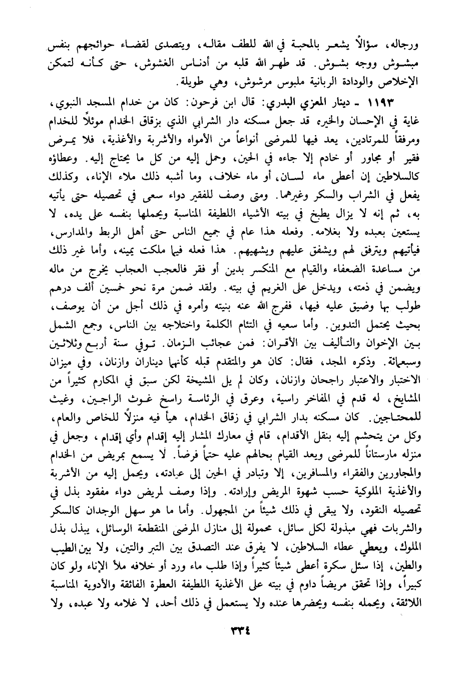 1193 - دينار المعزي البدري قال ابن فرحون كان من خدام المسجد النبوي غاية في الإحسان والخيره قد جعل مسكنه دار الشرابي الذي بزقاق الخدام موئلا للخدام ومرفقا للمرتادين يعد فيها للمرضى أنواعا من الأمواه والأشربة والأغذية فلا يمرض فقير أو مجاور أو خادم إلا جاءه في الحين وحمل إليه من كل ما يحتاج إليه وعطاؤه كالسلاطين إن أعطى ماء لسان أو ماء خلاف وما أشبه ذلك ملاء الإناء وكذلك يفعل في الشراب والسكر وغيرهما ومتى وصف للفقير دواء سعى في تحصيله حتى يأتيه به ثم إنه لا يزال يطبخ في بيته الأشياء اللطيفة المناسبة ويحملها بنفسه على يده لا يستعين بعبده ولا بغلامه وفعله هذا عام في جميع الناس حتى أهل الربط والمدارس فيأتيهم ويترفق لهم ويشفق عليهم ويشهيهم هذا فعله فيما ملكت يمينه وأما غير ذلك من مساعدة الضعفاء والقيام مع المنكسر بدين أو فقر فالعجب العجاب يخرج من ماله ويضمن في ذمته ويدخل على الغريم في بيته ولقد ضمن مرة نحو خمسين ألف درهم طولب بها وضيق عليه فيها ففرج الله عنه بنيته وأمره في ذلك أجل من أن يوصف بحيث يحتمل التدوين وأما سعيه في التئام الكلمة واختلاجه بين الناس وجمع الشمل بين الإخوان والتأليف بين الأقران فمن عجائب الزمان توفي سنة أربع وثلاثين وسبعمائة وذكره المجد فقال كان هو والمتقدم قبله كأنهما ديناران وازنان وفي ميزان الاختبار والاعتبار راجحان وازنان وكان لم يل المشيخة لكن سبق في المكارم كثيرا من المشايخ له قدم في المفاخر راسية وعرق في الرئاسة راسخ غوث الراجين وغيث للمحتاجين كان مسكنه بدار الشرابي في زقاق الخدام هيأ فيه منزلا للخاص والعام وكل من يتحشم إليه بنقل الأقدام قام في معارك المشار إليه إقدام وأي إقدام وجعل في منزل مارستانا للمرضى ويعد القيام بحالهم عليه حتما فرضا لا يسمع بمريض من الخدام والمجاورين والفقراء والمسافرين إلا وتبادر في الحين إلى عيادته ويحمل إليه من الأشربة والأغذية الملوكية حسب شهوة المريض وإرادته وإذا وصف لمريض دواء مفقود بذل في تحصيله النقود ولا يبقى في ذلك شيئا من المجهول وأما ما هو سهل الوجدان كالسكر والشربات فهي مبذولة لكل سائل محمولة إلى منازل المرضى المنقطعة الوسائل يبذل بذل الملوك ويعطي عطاء السلاطين لا يفرق عند التصدق بين التبر والتين ولا بين الطيب والطين إذا سئل سكرة أعطى شيئا كثيرا وإذا طلب ماء ورد أو خلافه ملأ الإناء ولو كان كبيرا وإذا تحقق مريضا داوم في بيته على الأغذية اللطيفة العطرة الفائقة والأدوية المناسبة اللائقة ويحمله بنفسه ويحضرها عنده ولا يستعمل في ذلك أحد لا غلامه ولا عبده ولا
