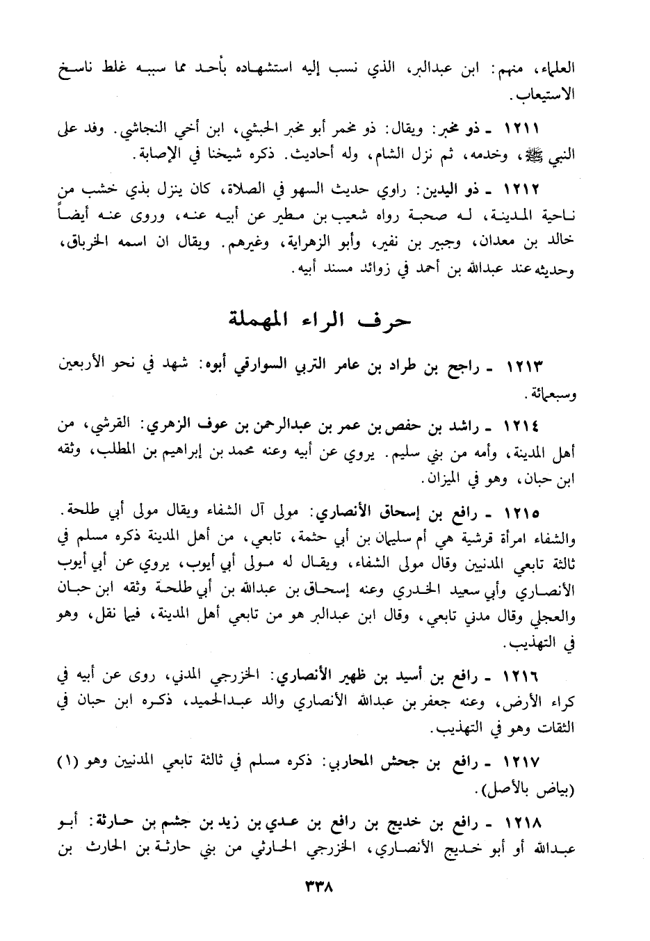 1216 - رافع بن أسيد بن ظهير الأنصاري الخزرجي المدني روى عن أبيه في كراء الأرض وعنه جعفر بن عبد الله الأنصاري والد عبد الحميد ذكره ابن حبان في الثقات وهو في التهذيب.