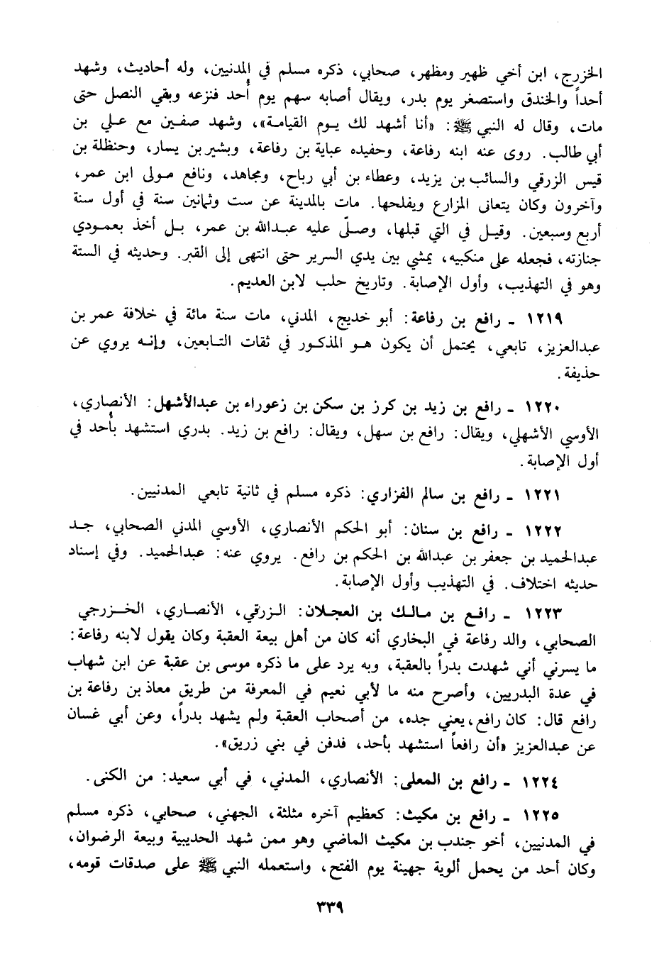 1220 - رافع بن زيد بن كرز بن سكن بن زعوراء بن عبد الأشهل الأنصاري الأوسي الأشهلي ويقال رافع بن سهل ويقال رافع بن زيد بدري استشهد بأحد في أول الإصابة.
