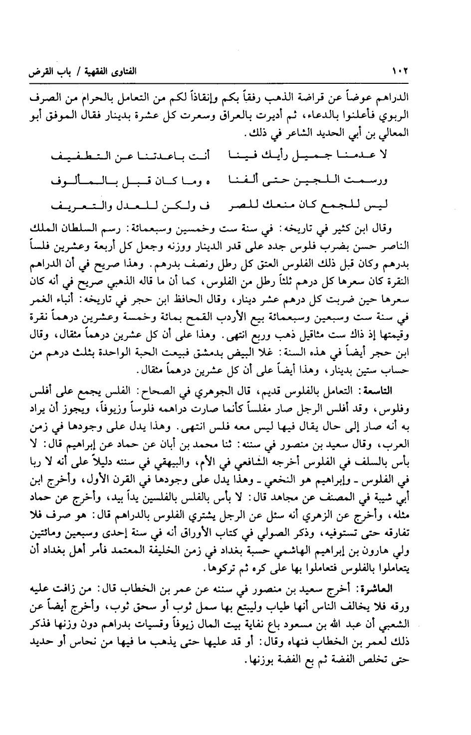 التاسعة: التعامل بالفلوس قديم، قال الجوهري في الصحاح: الفلس يجمع على أفلس وفلوس، وقد أفلس الرجل صار مفلساً كأنما صارت دراهمه فلوساً وزيوفاً، ويجوز أن يراد به أنه صار إلى حال يقال فيها ليس معه فلس انتهى. وهذا يدل على وجودها في زمن العرب، وقال سعيد بن منصور في سننه: ثنا محمد بن أبان عن حماد عن إبراهيم قال: لا بأس بالسلف في الفلوس أخرجه الشافعي في الأم، والبيهقي في سننه دليلاً على أنه لا ربا في الفلوس وإبراهيم هو النخعي وهذا يدل على وجودها في القرن الأول، وأخرج ابن أبي شيبة في المصنف عن مجاهد قال: لا بأس بالفلس بالفلسين يداً بيد، وأخرج عن حماد مثله، وأخرج عن الزهري أنه سئل عن الرجل يشتري الفلوس بالدراهم قال: هو صرف فلا تفارقه حتى تستوفيه، وذكر الصولي في كتاب الأوراق أنه في سنة إحدى وسبعين ومائتين ولي هرون بن إبراهيم الهاشمي حسبة بغداد في زمن الخليفة المعتمد فأمر أهل بغداد أن يتعاملوا بالفلوس فتعاملوا بها على كره ثم تركوها.