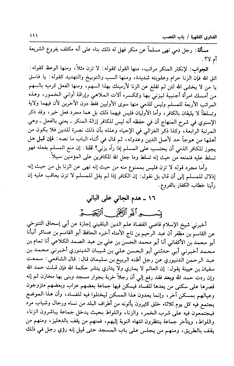أخبرني شيخ الإسلام قاضي القضاة علم الدين البلقيني إجازة عن أبي إسحاق التنوخي عن القاسم بن مظفر أن عبد الرحيم بن تاج الأمناء أخبره الحافظ إبو القاسم بن عساكر أنبأنا أبو محمد ابن الأكفاني أنا أبو محمد الحسن بن علي بن عبد الصمد الكلاعي أنا تمام بن محمد أخبرني أبي حدثني أبو الحسن علي بن شيبان الدينوري أخبرني محمد بن عبد الرحمن الدنيوري عن رجل أظنه الربيع ابن سليمان قال: قال الشافعي: سمعت سفيان بن عيينة يقول: إن العالم لا يماري ولا يداري ينشر حكمة الله فإن قبلت حمد الله وإن ردت حمد الله وبعد فقد رفع إلي أن رجلاً خربة بجوار مسجد وبنى بها مخازن ثم أنه قصرها على سكنى من يعدها للفساد فيسكن فيها جماعة بعضهم عزاب وبعضهم متزوجون وعيالهم بمسكن آخر، وإنما يعدون هذا المسكن ليختلوا فيه للفساد، وأن هذا الموضع يجتمع فيه كل يوم ثلاثاء خلق كثيرون يأتونه من أطراف البلد من نساء ورجال وشباب مرد فيجتمعون فيه على شرب الخمر، والزنا، واللواط بحيث يدخل جماعة يباشرون الزنا، واللواط، ويتأخر جماعة ينتظرون انتهاء النوبة إليهم، فمنهم من يقف بالدهليز، ومنهم من يقف بالطريق، ومنهم من يجلس على باب المسجد حتى قيل أنه رؤي رجل في ذلك