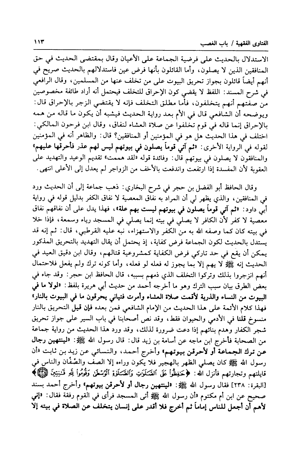 وقال الحافظ أبو الفضل بن حجر في شرح البخاري: ذهب جماعة إلى أن الحديث ورد في المنافقين، والذي يظهر لي أن المراد به نفاق المعصية لا نفاق الكفر بدليل قوله في رواية أبي داود: (دثم آتي قوماً يصلون في بيوتهم ليست بهم علة)، فهذا يدل على أن نفاقهم نفاق معصية لا كفر لأن الكافر لا يصلي في بيته إنما يصلي في المسجد رياء وسمعة، فإذا خلا في بيته كان كما وصفه الله به من الكفر والاستهزاء، نبه عليه القرطبي، قال: ثم أنه قد يستدل بالحديث لكون الجماعة فرض كفاية، إذ يحتمل أن يقال التهديد بالتحريق المذكور يمكن أن يقع في حد تاركي فرض الكفاية كمشروعية قتالهم، وقال ابن دقيق العيد في الحديث إنه صلى الله عليه وسلّم لا يهم إلا بما يجوز له فعله، وأما كونه ترك ولم يفعل فلاحتمال أنهم انزجروا بذلك وتركوا التخلف الذي ذمهم بسببه، قال الحافظ ابن حجر: وقد جاء في بعض الطرق بيان سبب الترك وهو ما أخرجه أحمد من حديث أبي هريرة بلفظ: (لولا ما في البيوت من النساء والذرية لأقمت صلاة العشاء وأمرت فتياني يحرقون ما في البيوت بالنار) فهذا كلام الأئمة على هذا الحديث من الإمام الشافعي فمن بعده فإن قيل التحريق بالنار منسوخ قلنا في الأدمي والحيوان فقط، وقد نص أصحابنا في باب السير على جواز تحريق شجر الكفار وهدم بنائهم إذا دعت ضرورة لذلك، وقد ورد هذا الحديث من رواية جماعة من الصحابة فأخرج ابن ماجه عن أسامة بن زيد قال: قال رسول الله صلى الله عليه وسلّم: (لينتهين رجال عن ترك الجماعة أو لأحرقن بيوتهم) وأخرج أحمد، والنسائي عن زيد بن ثابت (أن رسول الله صلى الله عليه وسلّم كان يصلي الظهر بالهجير فلا يكون وراءه إلا الصف والصَّفَّان والناس في قايلتهم وتجارتهم فأنزل الله:) حافظوا على الصلوات والصلاة الوسطى (فقال رسول الله صلى الله عليه وسلّم: (لينتهين رجال أو لأحرقن بيوتهم) وأخرج أحمد بسند صحيح عن ابن أم مكتوم (أن رسول الله صلى الله عليه وسلّم أتى المسجد فرأى في القوم رفقة فقال: (إني لأهم أن أجعل للناس إماماً ثم أخرج فلا أقدر على إنسان يتخلف عن الصلاة في بيته إلا