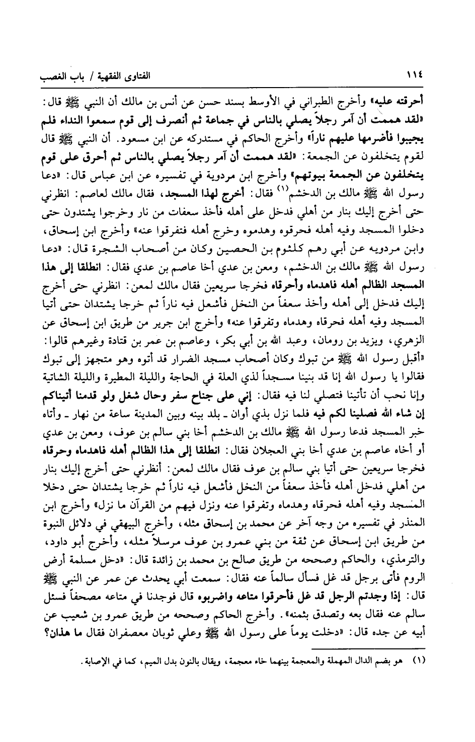 أحرقته عليه ) وأخرج الطبراني في الأوسط بسند حسن عن أنس بن مالك أن النبي صلى الله عليه وسلّم قال : ( لقد هممت أن آمر رجلاً يصلي بالناس في جماعة ثم أنصرف إلى قوم سمعوا النداء فلم يجيبوا فأضرمها عليهم ناراً ) وأخرج الحاكم في مستدركه عن ابن مسعود. أن النبي صلى الله عليه وسلّم قال لقوم يتخلفون عن الجمعة : ( لقد هممت أن آمر رجلاً يصلي بالناس ثم أحرق على قوم يتخلفون عن الجمعة بيوتهم ) وأخرج ابن مردوية في تفسيره عن ابن عباس قال : ( دعا رسول الله صلى الله عليه وسلّم مالك بن الدخشم فقال : أخرج لهذا المسجد ، فقال مالك لعاصم : انظرني حتى أخرج إليك بنار من أهلي فدخل على أهله فأخذ سعفات من نار وخرجوا يشتدون حتى دخلوا المسجد وفيه أهله فحرقوه وهدموه وخرج أهله فتفرقوا عنه ) وأخرج ابن إسحاق ، وابن مردويه عن أبي رهم كلثوم بن الحصين وكان من أصحاب الشجرة قال : ( دعا رسول الله صلى الله عليه وسلّم مالك ابن الدخشم ، ومعن بن عدي أخا عاصم بن عدي فقال : انطلقا إلى هذا المسجد الظالم أهله فاهدماه وأحرقاه فخرجا سريعين فقال مالك لمعن : انظرني حتى أخرج إليك فدخل إلى أهله وأخذ سعفاً من النخل فأشعل فيه ناراً ثم خرجا يشتدان حتى أتيا المسجد وفيه أهله فحرقاه وهدماه وتفرقوا عنه ) وأخرج ابن جرير من طريق ابن إسحق عن الزهري ، ويزيد بن رومان ، وعبد الله بن أبي بكر ، وعاصم بن عمر بن قتادة وغيرهم قالوا : ( أقبل رسول الله صلى الله عليه وسلّم من تبوك وكان أصحاب مسجد الضرار قد أتوه وهو متجهز إلى تبوك فقالوا يا رسول الله إنا قد بنينا مسجداً لذي العلة في الحاجة والليلة المطيرة والليلة الشاتية وإنا نحب أن تأتينا فنصلي لنا فيه فقال : إني على جناح سفر وحال شغل ولو قدمنا أتيناكم إن شاء الله فصلينا لكم فيه فلما نزل بذي أوان بلد بينه وبين المدينة ساعة من نهار وأتاه خبر المسجد فدعا رسول الله صلى الله عليه وسلّم مالك بن الدخشم أخا بني سالم بن عوف ، ومعن بن عدي أو أخاه عاصم بن عدي أخا بني العجلان فقال : انطلقا إلى هذا الظالم أهله فاهدماه وحرقاه فخرجا سريعين حتى أتيا بني سالم بن عوف فقال مالك لمعن : أنظرني حتى أخرج إليك بنار من أهلي فدخل أهله فأخذ سعفاً من النخل فأشعل فيه ناراً ثم خرجا يشتدان حتى دخلا المسجد وفيه أهله فحرقاه وهدماه وتفرقوا عنه ونزل فيهم من القرآن ما نزل ) وأخرج ابن المنذر في تفسيره من وجه آخر عن محمد بن إسحاق مثله ، وأخرج البيهقي في دلائل النبوة من طريق ابن إسحق عن ثقة من بني عمرو بن عوف مرسلاً مثله ، وأخرج أبو داود ، والترمذي ، والحاكم وصححه من طريق صالح بن محمد بن زائدة قال : ( دخل مسلمة أرض الروم فأتى برجل قد غل فسأل سالماً عنه فقال : سمعت أبي يحدث عن عمر عن النبي صلى الله عليه وسلّم قال : إذا وجدتم الرجل قد غل فأحرقوا متاعه واضربوه قال فوجدنا في متاعه مصحفاً فسئل سالم عنه فقال بعه وتصدق بثمنه ). وأخرج الحاكم وصححه من طريق عمرو بن شعيب عن أبيه عن جده قال : ( دخلت يوماً على رسول الله صلى الله عليه وسلّم وعلي ثوبان معصفران فقال ما هذان ؟