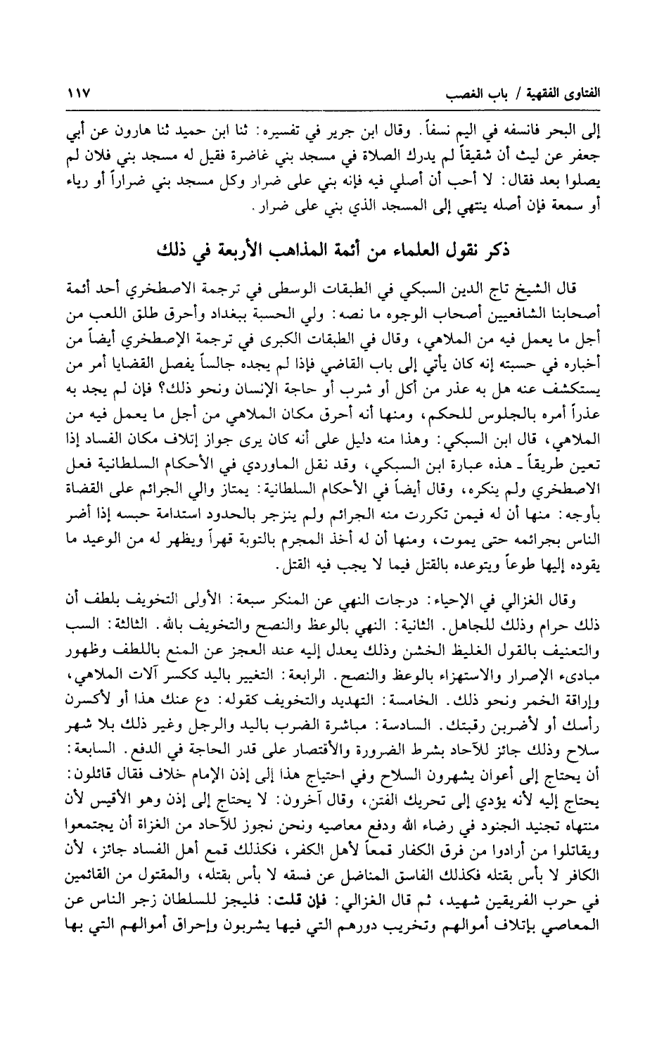 قال الشيخ تاج الدين السبكي في الطبقات الوسطى في ترجمة الاصطخري أحد أئمة أصحابنا الشافعيين أصحاب الوجوه ما نصه: ولي الحسبة ببغداد وأحرق طلق اللعب من أجل ما يعمل فيه من الملاهي، وقال في الطبقات الكبرى في ترجمة الإصطخري أيضاً من أخباره في حسبته أنه كان يأتي إلى باب القاضي فإذا لم يجده جالساً يفصل القضايا أمر من يستكشف عنه هل به عذر من أكل أو شرب أو حاجة الإنسان ونحو ذلك؟ فإن لم يجد به عذراً أمره بالجلوس للحكم، ومنها أنه أحرق مكان الملاهي من أجل ما يعمل فيه من الملاهي، قال ابن السبكي: وهذا منه دليل على أنه كان يرى جواز إتلاف مكان الفساد إذا تعين طريقاً هذه عبارة ابن السبكي، وقد نقل الماوردي في الأحكام السلطانية فعل الاصطخري ولم ينكره، وقال أيضاً في الأحكام السلطانية: يمتاز والى الجرائم على القضاة بأوجه: منها أن له فيمن تكررت منه الجرائم ولم ينزجر بالحدود استدامة حبسه إذا أضر الناس بجرائمه حتى يموت، ومنها أن له أخذ المجرم بالتوبة قهراً ويظهر له من الوعيد ما يقوده إليها طوعاً ويتوعده بالقتل فيما لا يجب في القتل.