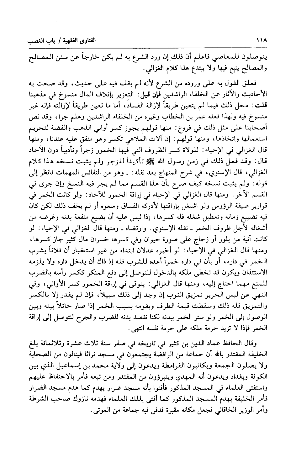 فعلق القول به على وروده من الشرع لأنه لم يقف فيه على حديث ، وقد صحت به الأحاديث والآثار عن الخلفاء الراشدين فإن قيل : التعزيز بإتلاف المال منسوخ في مذهبنا قلت : محل ذلك فيما لم يتعين طريقاً لإزالة الفساد ، أما ما تعين طريقاً لإزالته فإنه غير منسوخ فيه ولهذا فعله عمر بن الخطاب وغيره من الخلفاء الراشدين وهلم جراً ، وقد نص أصحابنا على مثل ذلك في فروع : منها قولهم يجوز كسر أواني الذهب والفضة لتحريم استعمالها واتخاذها ، ومنها قولهم : أن آلات الملاهي تكسر وهو متفق عليه عندنا ، ومنها قال الغزالي في الإحياء : للولاة كسر الظروف التي فيها الخمور زجراً وتأديباً دون الآحاد قال : وقد فعل ذلك في زمن رسول الله صلى الله عليه وسلّم تأكيداً للزجر ولم يثبت نسخه هذا كلام الغزالي ، قال الأسنوي ، في شرح المنهاج بعد نقله : وهو من النفائس المهمات فانظر إلى قوله : ولم يثبت نسخه كيف صرح بأن هذا القسم مما لم يجر فيه النسخ وإن جرى في القسم الآخر. ومنها قال الغزالي في الإحياء في إراقة الخمور للآحاد : ولو كانت الخمر في قوارير ضيقة الرؤوس ولو اشتغل بإراقتها لأدركه الفساق ومنعوه أو لم يخف ذلك لكن كان فيه تضييع زمانه وتعطيل شغله فله كسرها ، إذا ليس عليه أن يضيع منفعة بدنه وغرضه من أشغاله لأجل ظروف الخمر نقله الأسنوي. وارتضاه ومنها قال الغزالي في الإحياء : لو كانت آنية من بلور أو زجاج على صورة حيوان وفي كسرها خسران مال كثير جاز كسرها ، ومنها قال الغزالي في الإحياء : لو أخبره عدلان أبتداء من غير استخبار أن فلاناً يشرب الخمر في داره ، أو بأن في داره خمراً أعده للشرب فله إذ ذاك أن يدخل داره ولا يلزمه الاستئذان ويكون قد تخطى ملكه بالدخول للتوصل إلى دفع المنكر ككسر رأسه بالضرب للمنع مهما احتاج إليه ، ومنها قال الغزالي : يتوقى في إراقة الخمور كسر الأواني ، وفي النهي عن لبس الحرير تمزيق الثوب أن وجد إلى ذلك سبيلاً ، فإن لم يقدر إلا بالكسر والتمزيق فله ذلك وسقطت قيمة الظرف ويقومه بسبب الخمر إذا صار حائلاً بينه وبين الوصول إلى الخمر ولو ستر الخمر ببدنه لكنا نقصد بدنه للضرب والجرح لنتوصل إلى إراقة الخمر فإذا لا تزيد حرمة ملكه على حرمة نفسه انتهى.