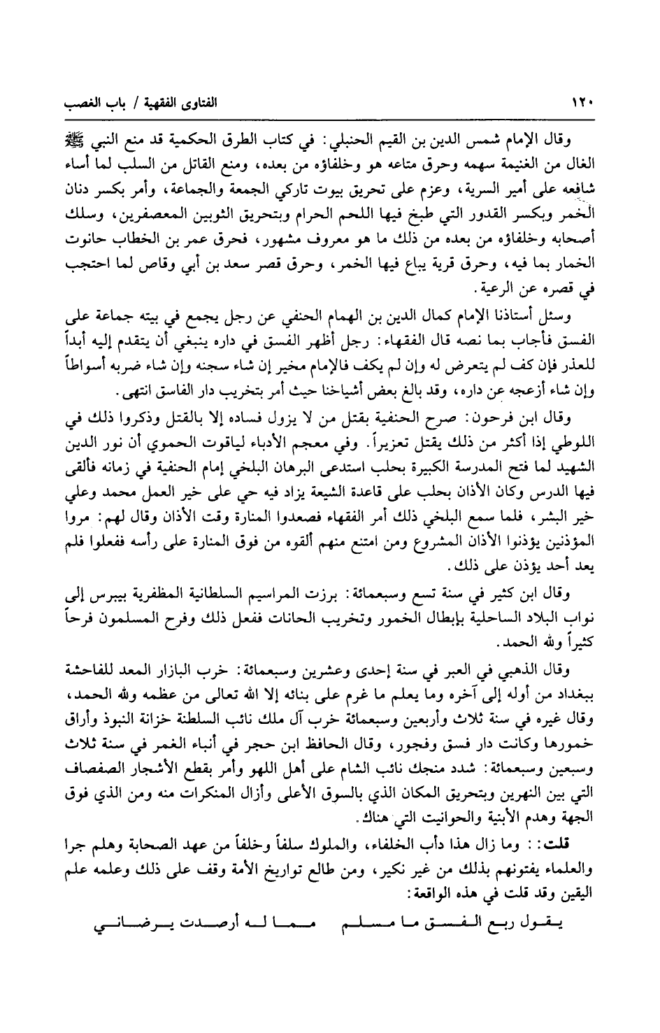 وقال الإمام شمس الدين بن القيم الحنبلي: في كتاب الطرق الحكمية قد منع النبي صلى الله عليه وسلّم الغال من الغنيمة سهمه وحرق متاعه هو وخلفاؤه من بعده، ومنع القاتل من السلب لما أساء شافعه على أمير السرية، وعزم على تحريق بيوت تاركي الجمعة والجماعة، وأمر بكسر دنان الخمر وبكسر القدور التي طبخ فيها اللحم الحرام وبتحريق الثوبين المعصفرين، وسلك أصحابه وخلفاؤه من بعده من ذلك ما هو معروف مشهور، فحرق عمر بن الخطاب حانوت الخمار بما فيه، وحرق قرية يباع فيها الخمر، وحرق قصر سعد بن أبي وقاص لما احتجب في قصره عن الرعية.