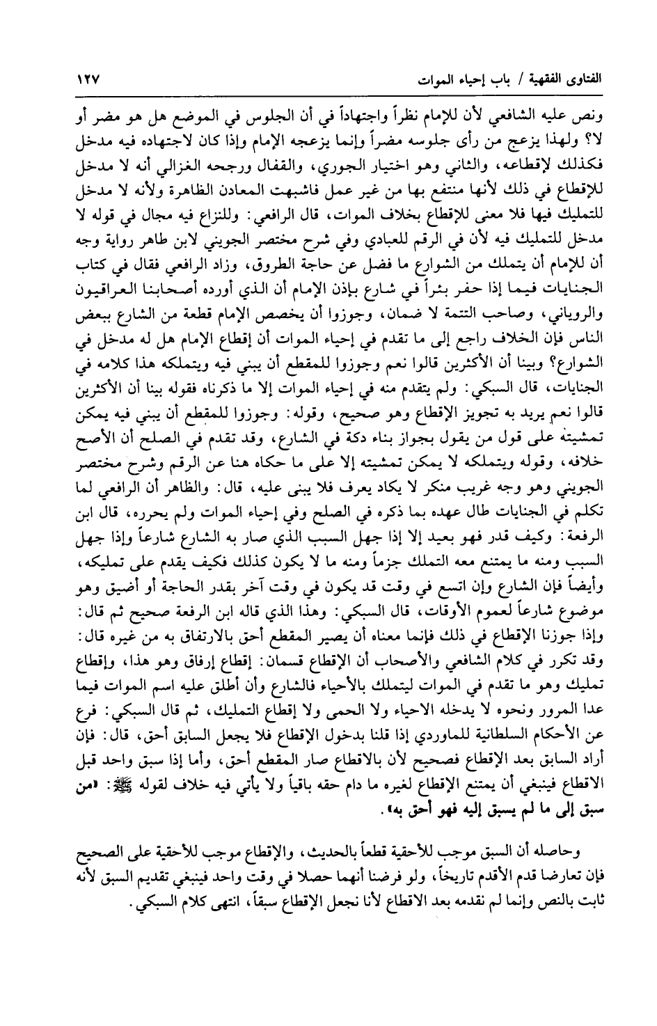وحاصله أن السبق موجب للأحقية قطعاً بالحديث، والإقطاع موجب للأحقية على الصحيح فإن تعارضا قدم الأقدم تاريخاً، ولو فرضنا أنهما حصلا في وقت واحد فينبغي تقديم السبق لأنه ثابت بالنص وإنما لم نقدمه بعد الاقطاع لأنا نجعل الإقطاع سبقاً، انتهى كلام السبكي.