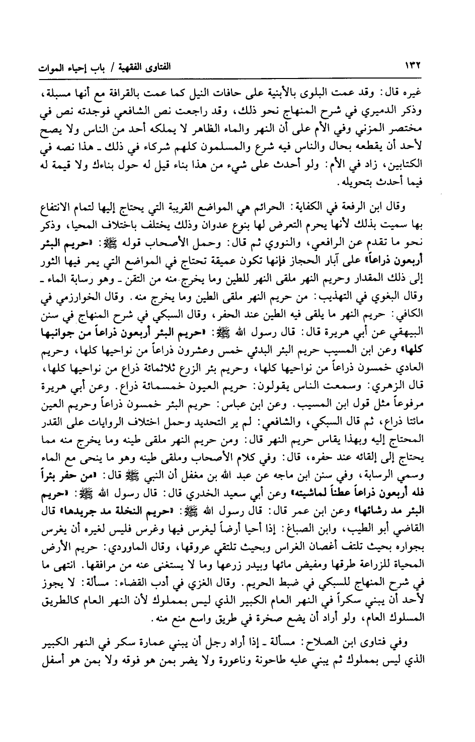 وقال ابن الرفعة في الكفاية : الحرائم هي المواضع القريبة التي يحتاج إليها لتمام الانتفاع بها سميت بذلك لأنها يحرم التعرض لها بنوع عدوان وذلك يختلف باختلاف المحيا ، وذكر نحو ما تقدم عن الرافعي ، والنووي ثم قال : وحمل الأصحاب قوله صلى الله عليه وسلّم : ( حريم البئر أربعون ذراعاً ) على آبار الحجاز فإنها تكون عميقة تحتاج في المواضع التي يمر فيها الثور إلى ذلك المقدار وحريم النهر ملقى النهر للطين وما يخرج منه من التقن وهو رسابة الماء وقال البغوي في التهذيب : من حريم النهر ملقى الطين وما يخرج منه. وقال الخوارزمي في الكافي : حريم النهر ما يلقى فيه الطين عند الحفر ، وقال السبكي في شرح المنهاج في سنن البيهقي عن أبي هريرة قال : قال رسول الله صلى الله عليه وسلّم : ( حريم البئر أربعون ذراعاً من جوانبها كلها ) وعن ابن المسيب حريم البئر البدئي خمس وعشرون ذراعاً من نواحيها كلها ، وحريم العادي خمسون ذراعاً من نواحيها كلها ، وحريم بئر الزرع ثلاثمائة ذراع من نواحيها كلها ، قال الزهري : وسمعت الناس يقولون : حريم العيون خمسمائة ذراع. وعن أبي هريرة مرفوعاً مثل قول ابن المسيب. وعن ابن عباس : حريم البئر خمسون ذراعاً وحريم العين مائتا ذراع ، ثم قال السبكي ، والشافعي : لم ير التحديد وحمل اختلاف الروايات على القدر المحتاج إليه وبهذا يقاس حريم النهر قال : ومن حريم النهر ملقى طينه وما يخرج منه مما يحتاج إلى إلقائه عند حفره ، قال : وفي كلام الأصحاب وملقى تقنه وهو ما ينحى مع الماء وسمي الرسابة ، وفي سنن ابن ماجه عن عبد الله بن مغفل أن النبي صلى الله عليه وسلّم قال : ( من حفر بئراً فله أربعون ذراعاً عطناً لماشيته ) وعن أبي سعيد الخدري قال : قال رسول الله صلى الله عليه وسلّم : ( حريم البئر مد رشائها ) وعن ابن عمر قال : قال رسول الله صلى الله عليه وسلّم : ( حريم النخلة مدجر يدها ) قال القاضي أبو الطيب ، وابن الصباغ : إذا أحيا أرضاً ليغرس فيها وغرس فليس لغيره أن يغرس بجواره بحيث تلتف أغصان الغراس وبحيث تلتقي عروقها ، وقال الماوردي : حريم الأرض المحياة للزراعة طرقها ومفيض مائها وبيدر زرعها وما لا يستغني عنه من مرافقها. انتهى ما في شرح المنهاج للسبكي في ضبط الحريم. وقال الغزي في أدب القضاء : مسألة : لايجوز لأحد أن يبني سكراً في النهر العام الكبير الذي ليس بمملوك لأن النهر العام كالطريق المسلوك العام ، ولو أراد أن يضع صخرة في طريق واسع منع منه.